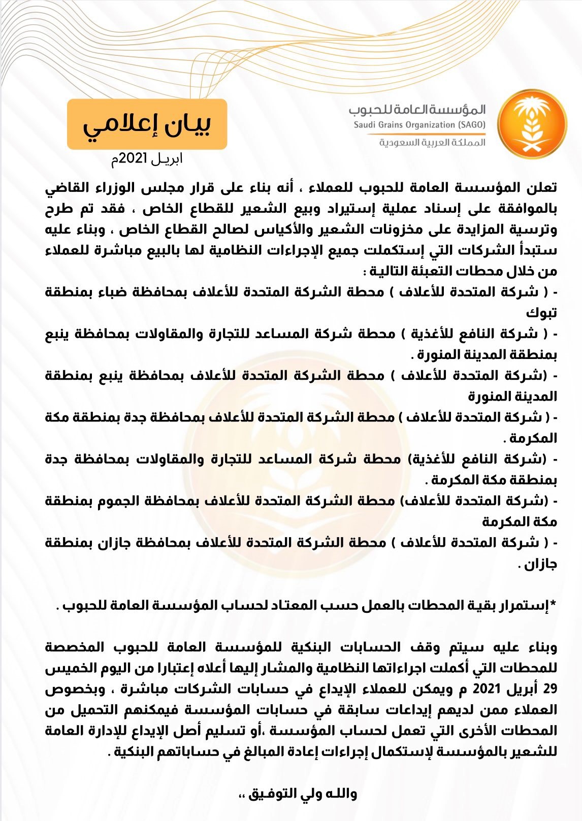 وبناء عليه سيتم وقف الحسابات البنكية للمؤسسة العامة للحبوب المخصصة للمحطات التي أكملت جراءاتها النظامية والمشار أعلاه إعتبارا من اليوم الخميس 29 أبريل 2021 م ، ويمكن للعملاء الإيداع في حسابات الشركات مباشرة ، وبخصوص العملاء ممن لديهم إيداعات سابقة في حسابات المؤسسة فيمكنهم التحميل من المحطات الأخرى التي تعمل لحساب المؤسسة ، أو تسليم أصل الإيداع للإدارة العامة للشعير بالمؤسسة لإستكمال إجراءات إعادة المبالغ في حساباتهم البنكية .