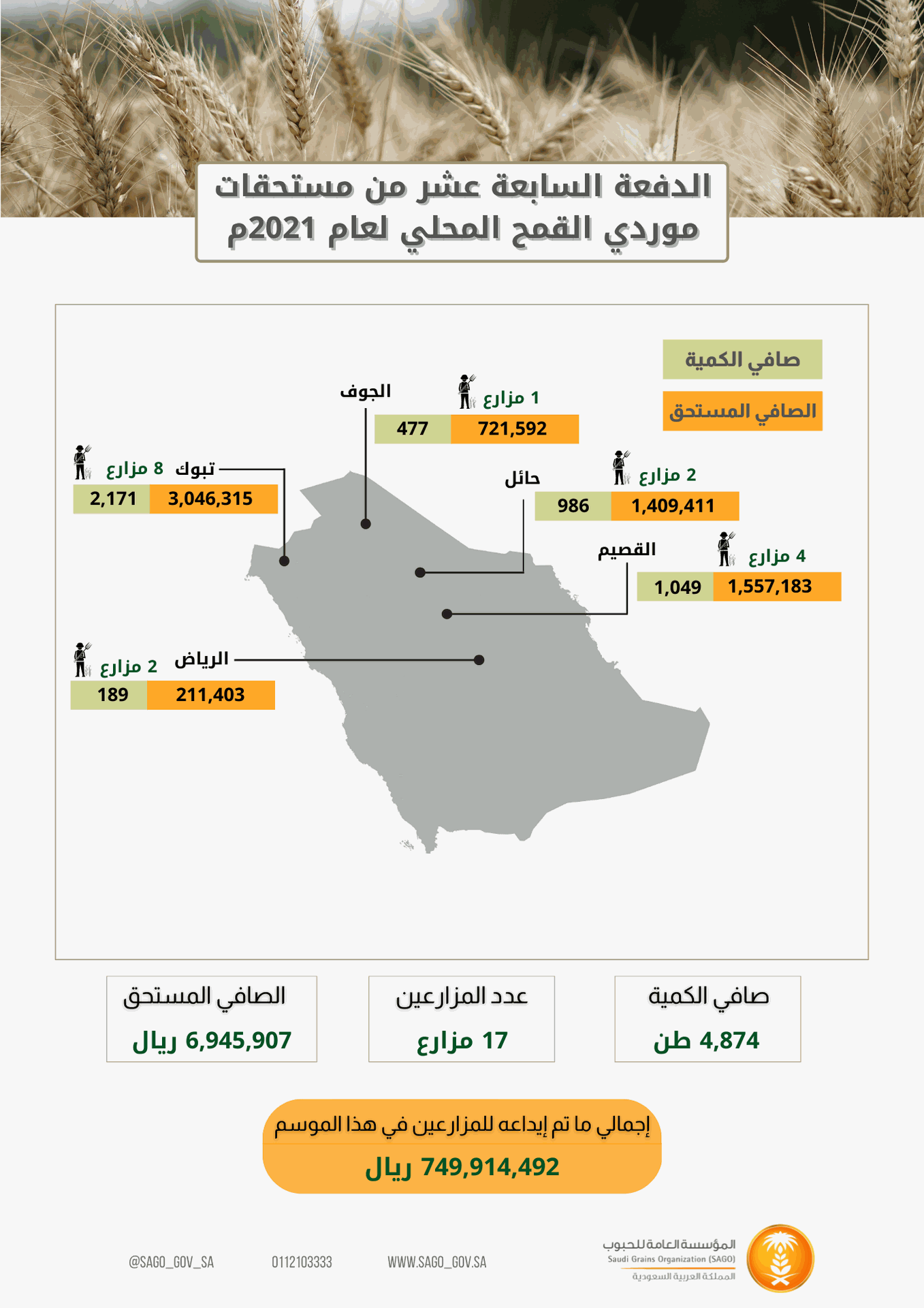 يذكر أن المؤسسة بدأت باستلام القمح المحلي من المزارعين للموسم الحالي اعتباراً من 22 شعبان 1442هـ، وقد بلغ إجمالي الكمية المستلمة من المزارعين حتى تاريخه (575,690) طن لعدد (2077) مزارع.