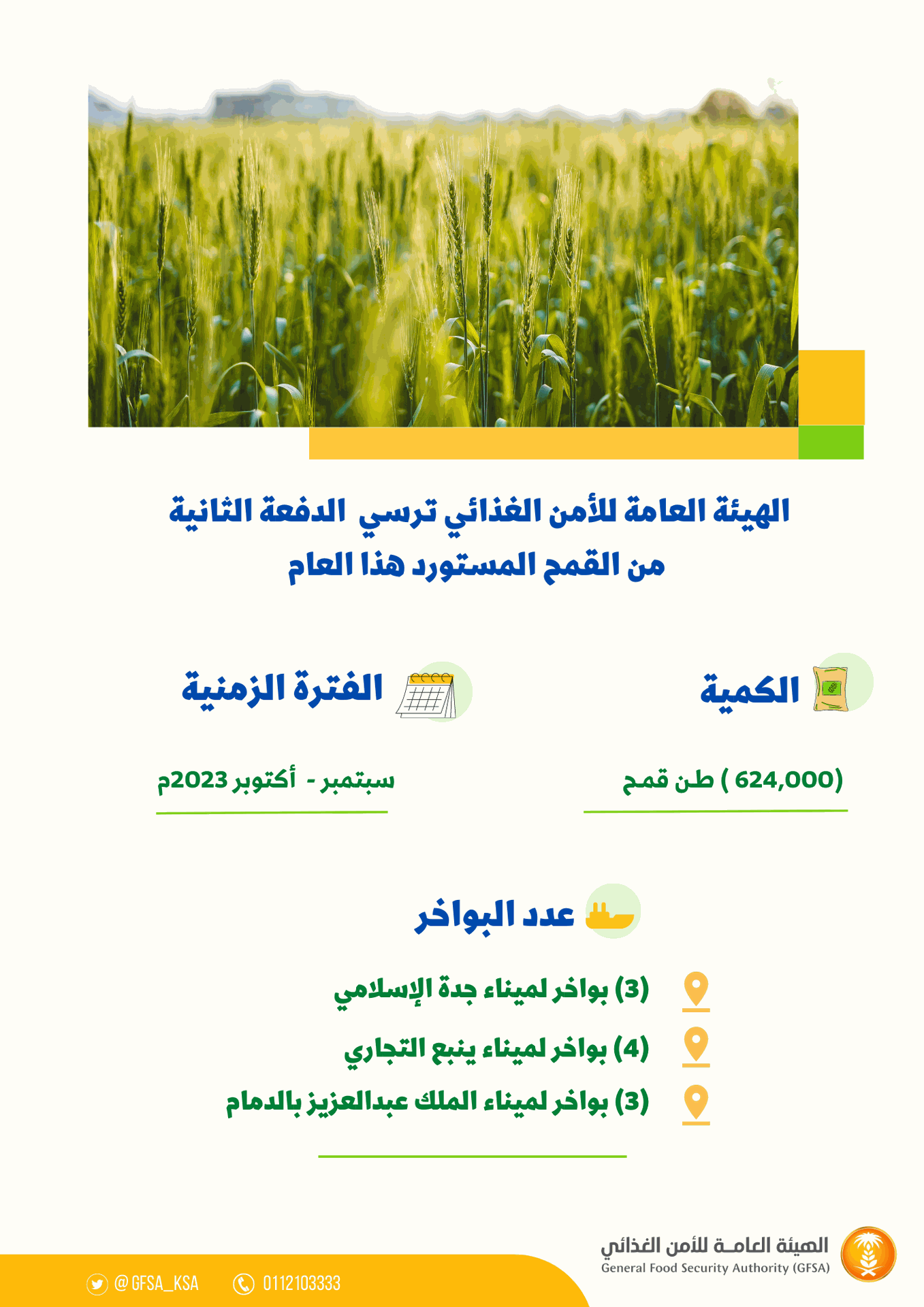 أتمت الهيئة إجراءات ترسية الدفعة الثانية من القمح المستورد لهذا العام (2023م) بكمية (624,000) طن للتوريد من مناشئ (الاتحاد الأوروبي، وأمريكا الشمالية والجنوبية، وأستراليا، والبحر الأسود).