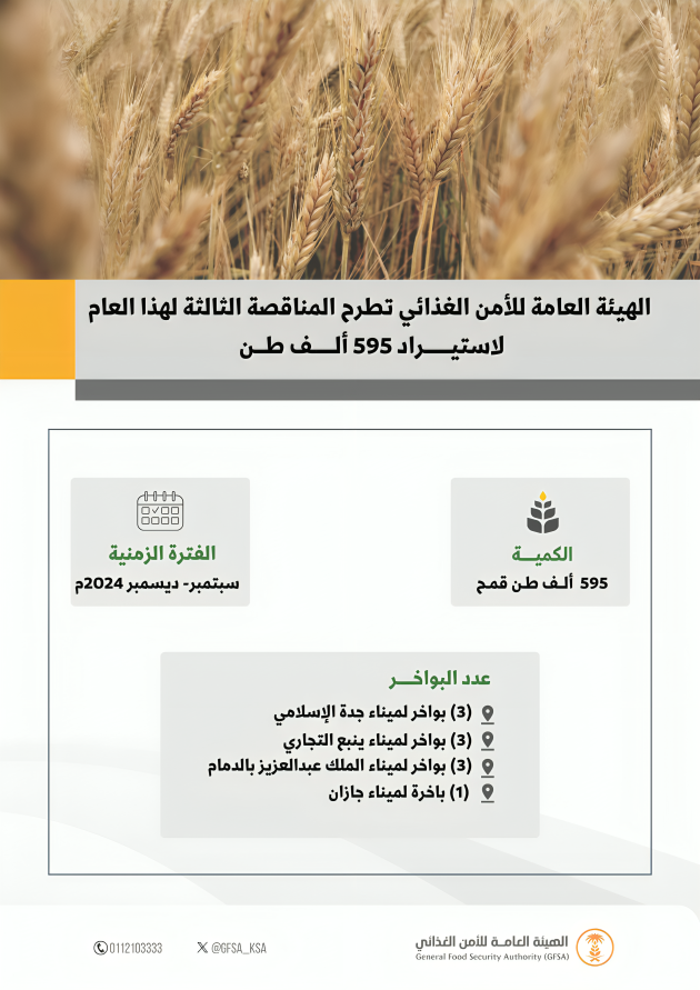 أعلنت الهيئة العامة للأمن الغذائي اليوم عن طرح المناقصة الثالثة لاستيراد القمح لهذا العام، وذلك لكمية (595) ألف طن للتوريد خلال الفترة ( سبتمبر – ديسمبر 2024م).