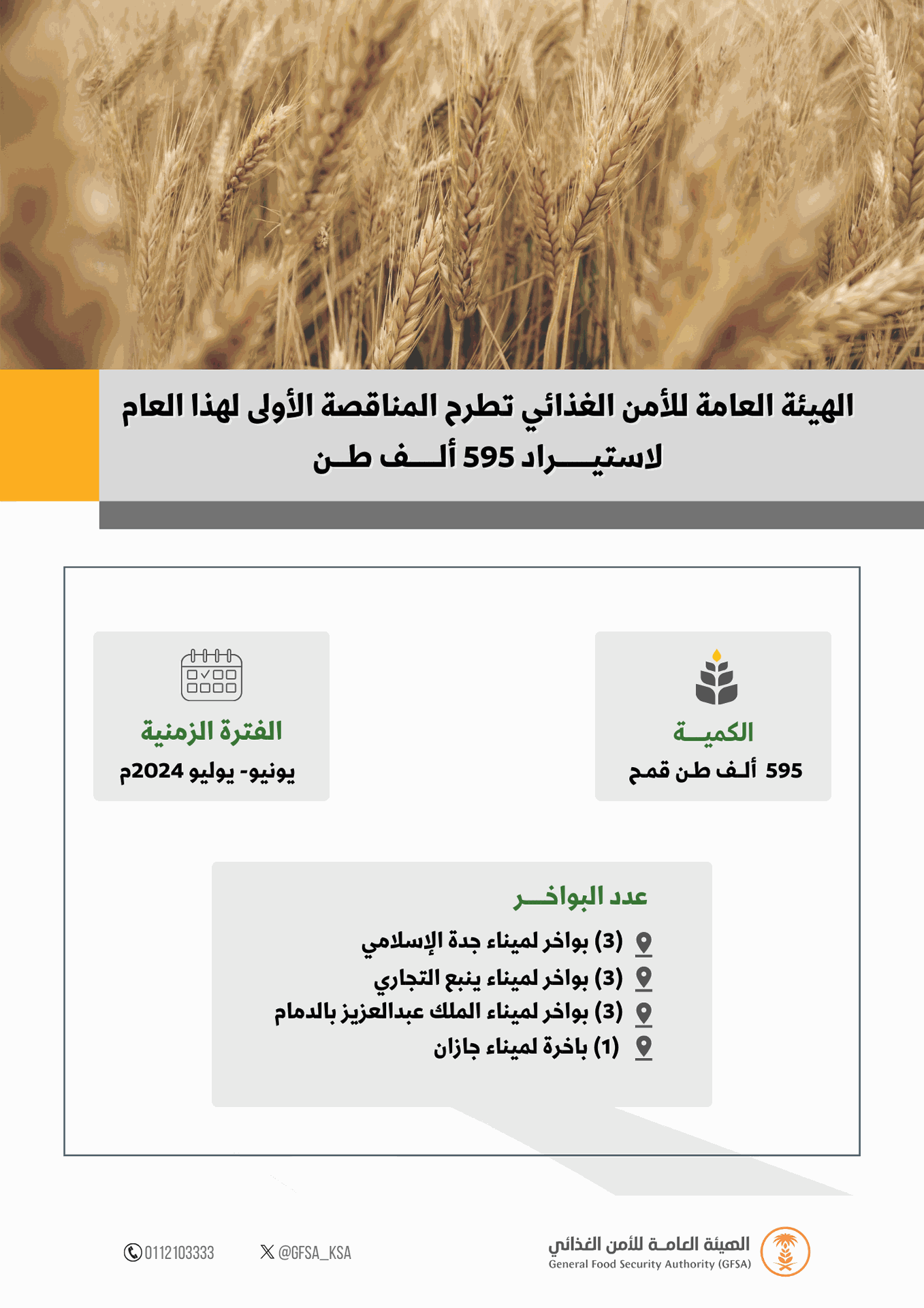 أعلنت الهيئة العامة للأمن الغذائي اليوم عن طرح المناقصة الأولى لاستيراد القمح لهذا العام، وذلك لكمية (595) ألف طن للتوريد خلال الفترة ( يونيو – يوليو 2024م).