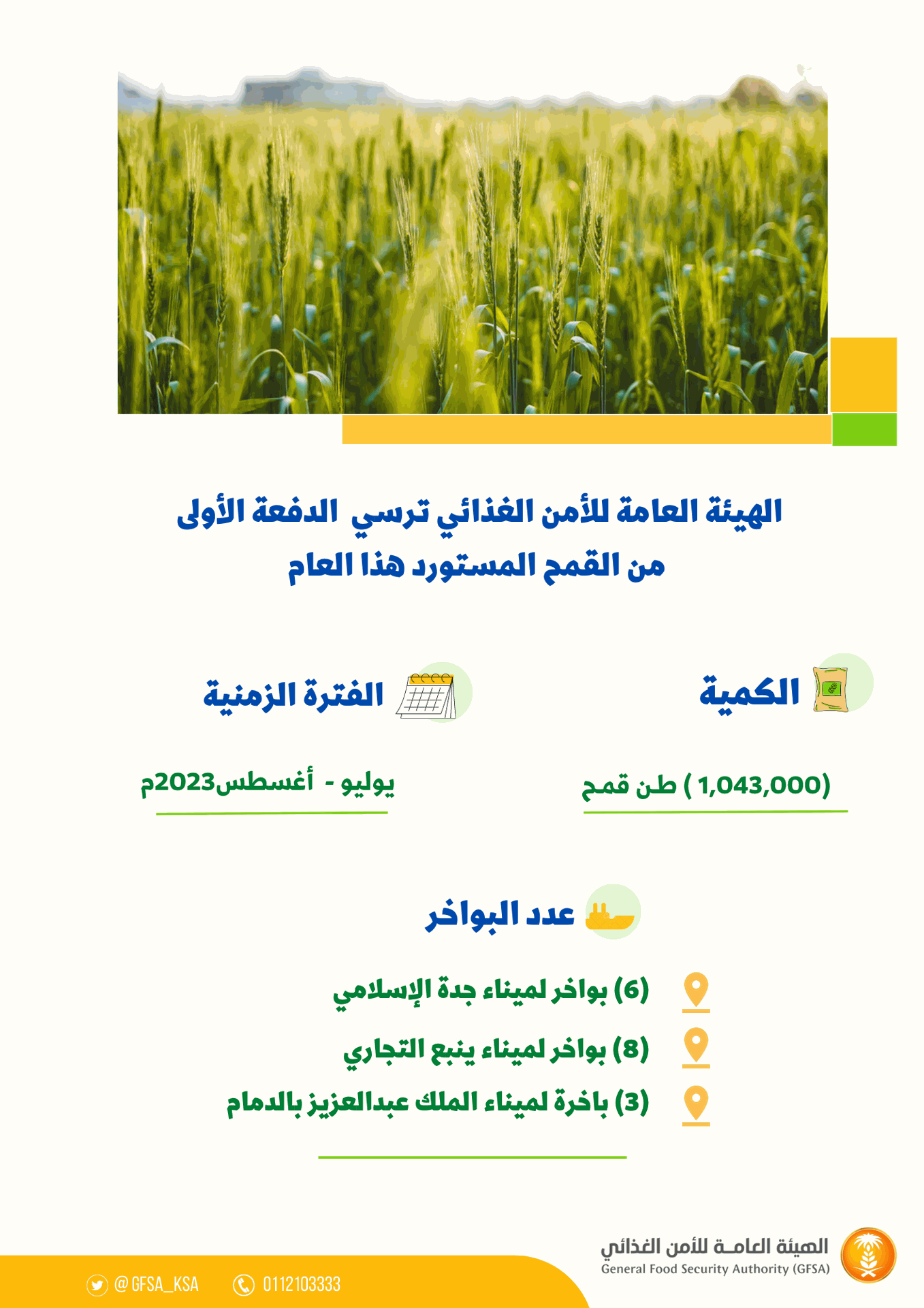 وأضاف أن فترة وصول الدفعة الأولى المتعاقد عليها ستكون خلال الفترة (يوليو - أغسطس2023م) بواقع (17) باخرة، موزعة على (6) بواخر لميناء جده الإسلامي بكمية (363) ألف طن، وعدد (8) بواخر لميناء ينبع التجاري بكمية (490) ألف طن، وعدد (3) بواخر لميناء الملك عبدالعزيز بالدمام بكمية (190) ألف طن، وتنافست (16) شركة عالمية مؤهلة ومتخصصة في تجارة الحبوب على الكمية المطلوبة، وتم الترسية على (6) شركات منها كانت عروضها مطابقة للمواصفات والأقل سعراً.