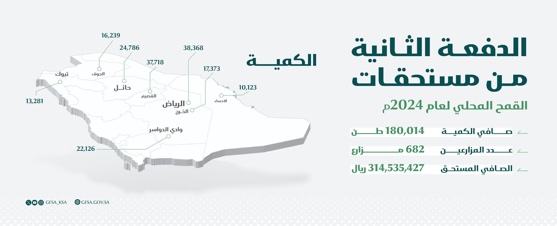 وبلغ صافي ما تم إيداعه في حسابات المزارعين البنكية لهذه الدفعة مبلغ (314,535,427) ريال، لصافي كمية مستلمة (180,014) طن، وذلك لعدد (682) مزارعاً. ليبلغ إجمالي ما تم صرفه للمزارعين لهذا الموسم مبلغ (609,712,603) ريال، وذلك لكمية (355,717) طن، لعدد (1,474) مزارع.