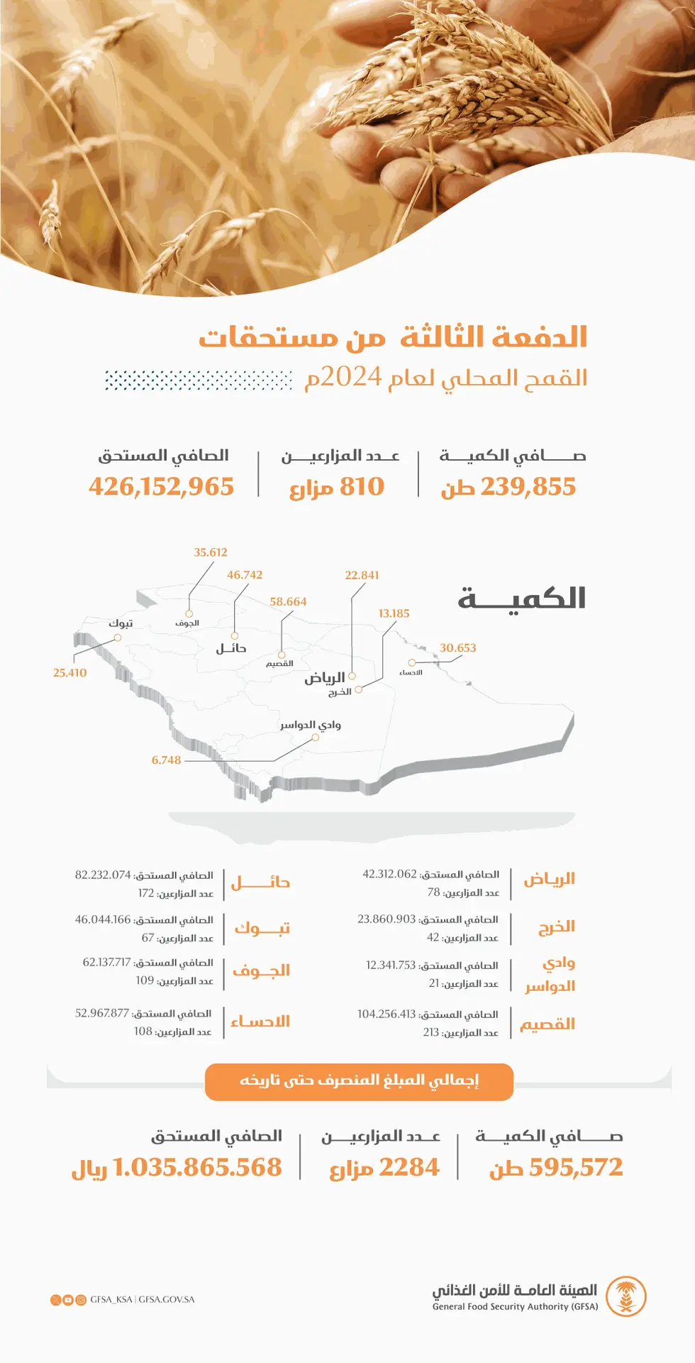وبلغ صافي ما تم إيداعه في حسابات المزارعين البنكية لهذه الدفعة مبلغ (426,152,965) ريال، لصافي كمية مستلمة (239,855) طن، وذلك لعدد (810) مزارعاً. ليبلغ إجمالي ما تم صرفه للمزارعين لهذا الموسم مبلغ (1,035,865,568) ريال، وذلك لكمية (595,572) طن، لعدد (2,284) مزارع.