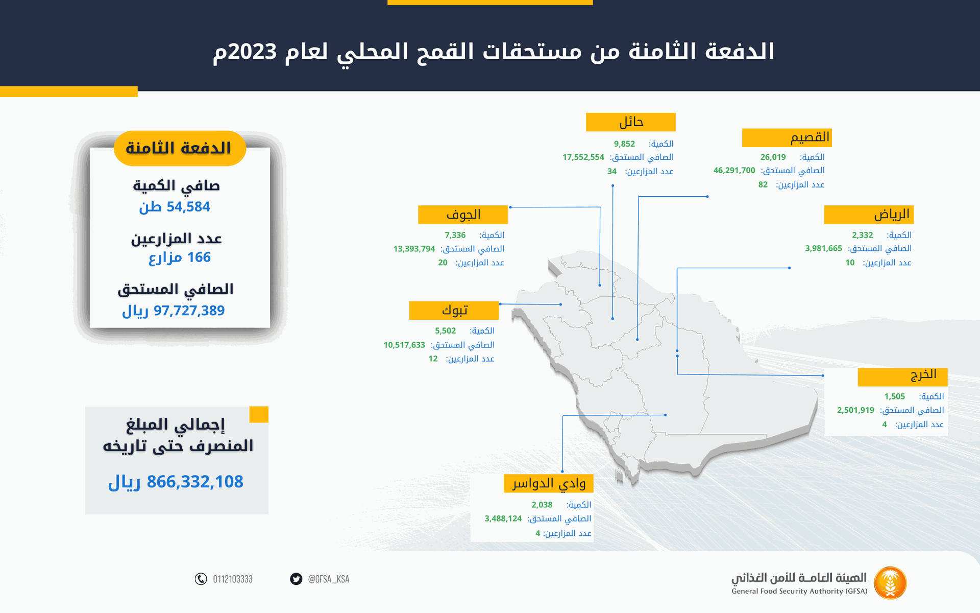 وبلغ صافي ما تم إيداعه في حسابات المزارعين البنكية لهذه الدفعة مبلغ (97,727,389) ريال، وذلك لكمية (54,584) طن، لعدد (166) مزارعاً. تتضمن (6) مزارعين من أصحاب العلاقة التعاقدية مع الشركات، ليبلغ إجمالي ما تم صرفه للمزارعين لهذا الموسم مبلغ (866,332,108) ريال، وذلك لكمية (494,143) طن، لعدد (1601) مزارع.