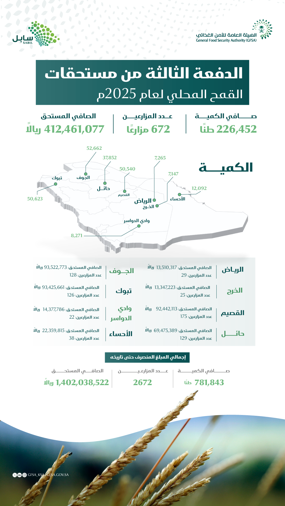 أعلنت الهيئة العامة للأمن الغذائي عن صرف مستحقات الدفعة الثالثة لمزارعي القمح المحلي، اللذين قاموا بتوريد الكميات المخصصة لهم لهذا الموسم 1447/1446هـ (2025م)، بفروع الشركة الوطنية لإمدادات الحبوب "سابل"، وأغلاق حساباتهم عبر المنصة الالكترونية "محصولي"، وذلك حتى تاريخ 1447/4/10هـ الموافق 2025/10/2م.