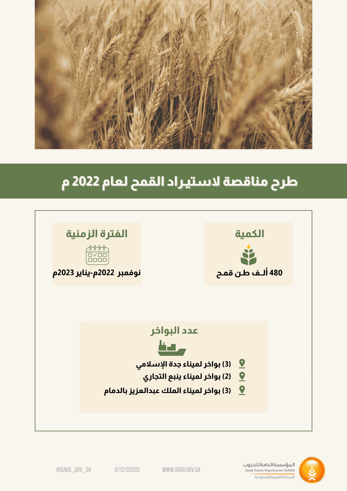 أعلنت المؤسسة العامة للحبوب اليوم عن طرح مناقصة لاستيراد كمية (480) ألف طن قمح للتوريد خلال الفترة ( نوفمبر2022 - يناير2023).