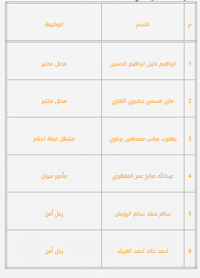 أسماء المقبولين على وظائف فرع المؤسسة (بالدمام) وتم إبلاغهم برسائل نصية على هواتفهم لإستكمال اجراءات التعيين حسب البيان الاتي: