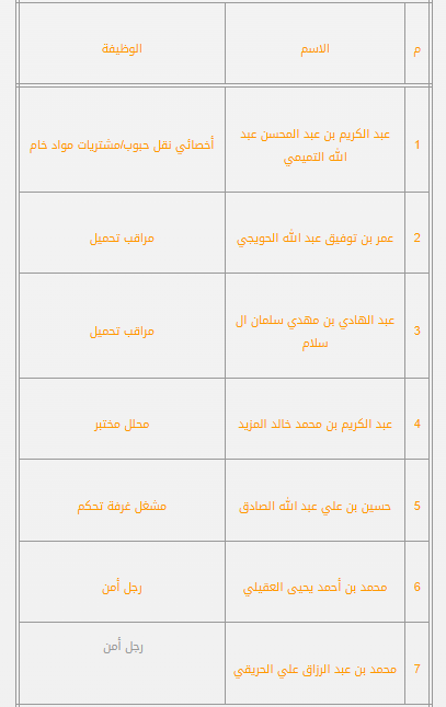 أسماء المقبولين على وظائف فرع المؤسسة (بتبوك) وتم إبلاغهم برسائل نصية على هواتفهم لإستكمال اجراءات التعيين حسب البيان الاتي:
