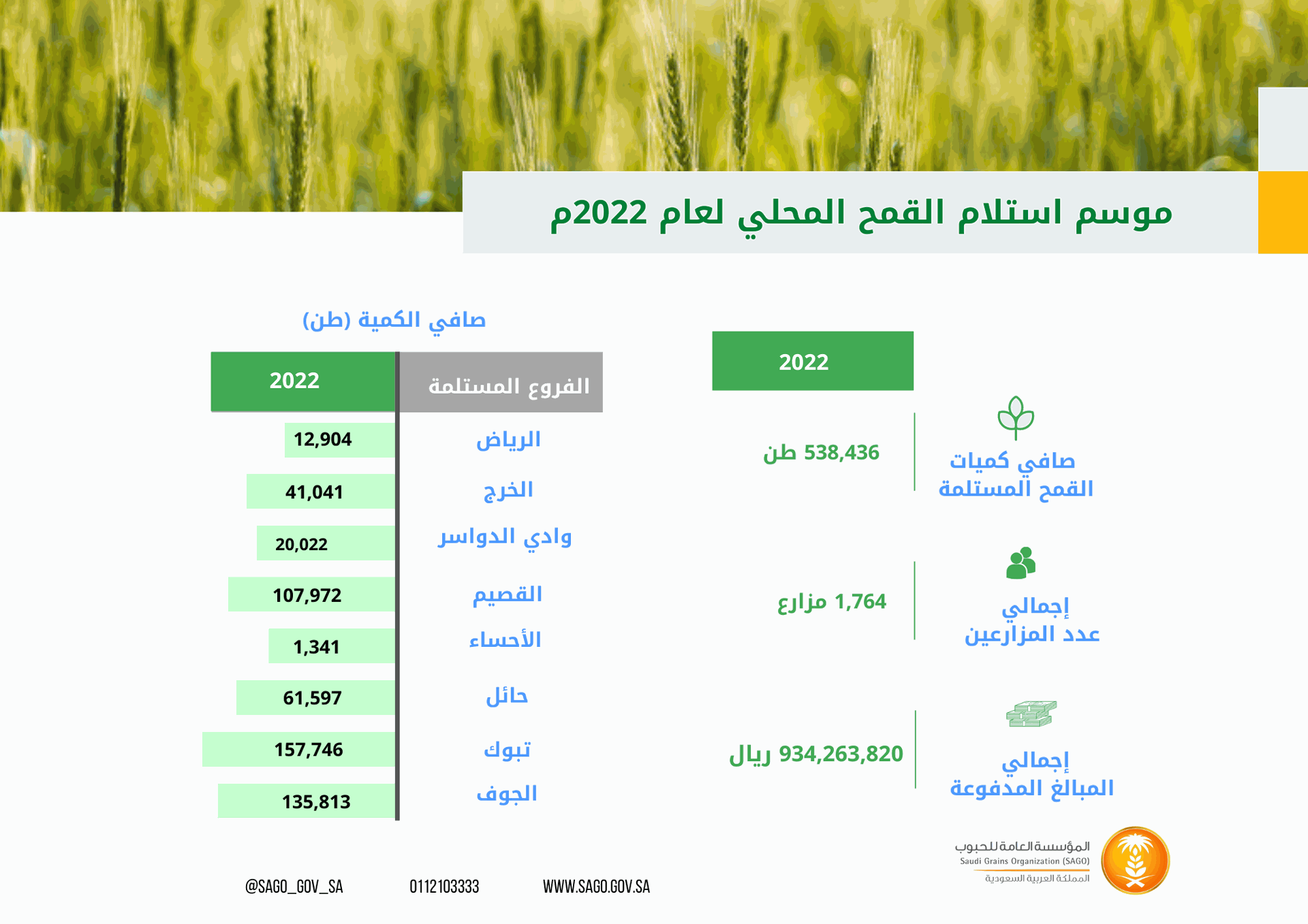 أعلنت المؤسسة عن انتهاء موسم شراء القمح المحلي للعام 1443/ 1444هـ (2022م) وذلك بتوريد صافي كمية (538,436) طن، بانخفاض 6.5% عن الموسم الماضي، وبقيمة بلغت نحو (934) مليون ريال، بارتفاع 20% عن الموسم الماضي، نتيجة زيادة سعر شراء القمح المحلي إلى (1700) ريال للطن تماشياً مع الارتفاع في أسعار القمح عالمياً.