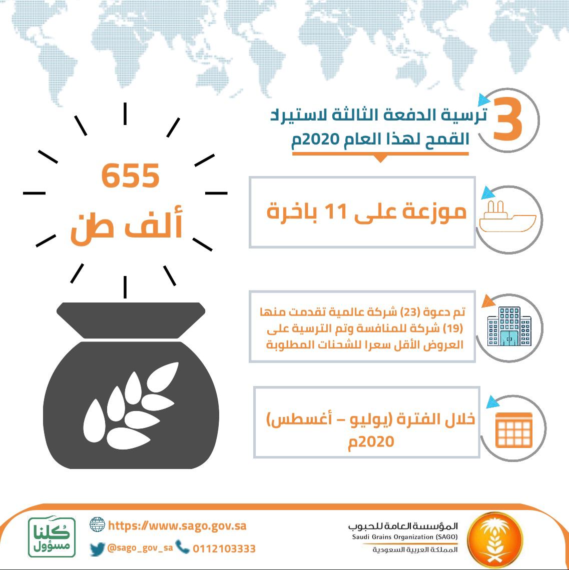 أتمت المؤسسة إجراءات ترسية الدفعة الثالثة من القمح المستورد لهذا العام (2020م) بكمية (655) ألف طن من القمح، من مناشئ الاتحاد الأوروبي، والبحر الأسود، وأستراليا، وأمريكا الجنوبية والشمالية (باستثناء كندا.(