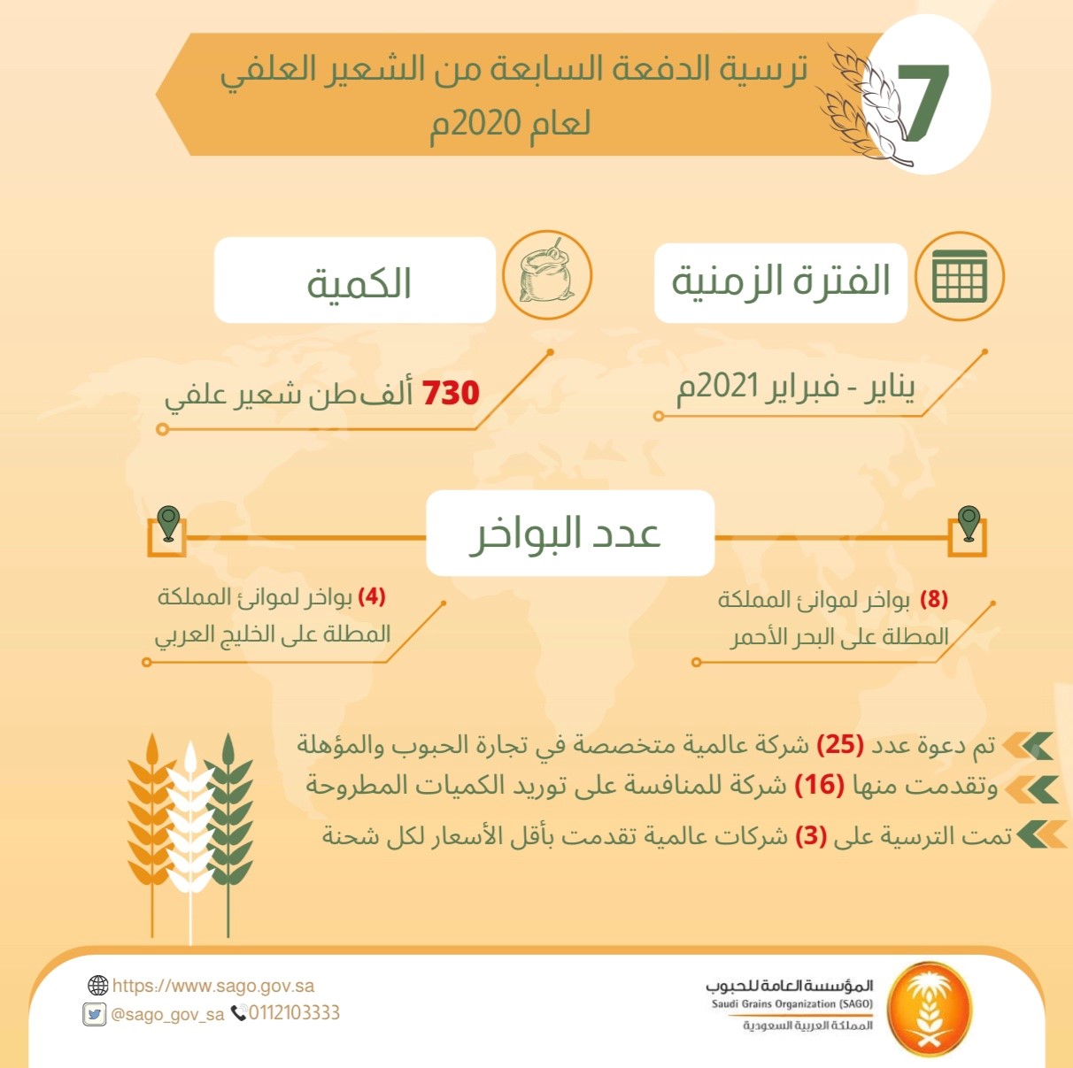 أتمت المؤسسة إجراءات ترسية استيراد كمية (730,000) طن من الشعير موزعة على مناشئ "الاتحاد الأوروبي، استراليا، البحر الاسود، أمريكا الجنوبية والشمالية (باستثناء كندا)، والتي تمثل الدفعة السابعة لكميات الشعير العلفي المتعاقد عليها هذا العام (2020م).