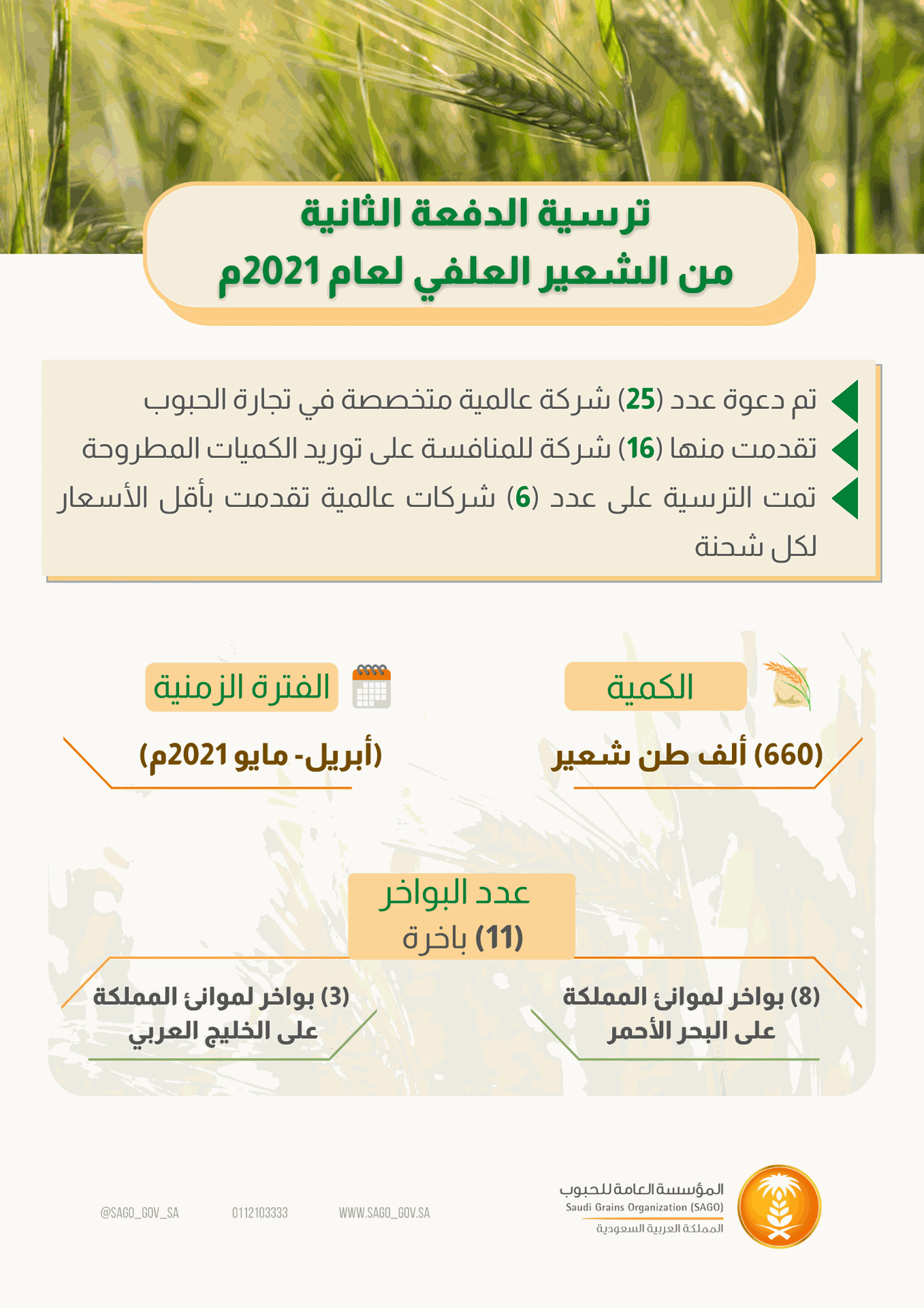 أتمت المؤسسة إجراءات ترسية استيراد كمية (660,000) طن من الشعير العلفي وذلك للتوريد خلال الفترة (إبريل - مايو2021م) لتعزيز المخزونات، في الوقت الذي يجري فيه استكمال نقل ملف استيراد وبيع الشعير للقطاع الخاص.