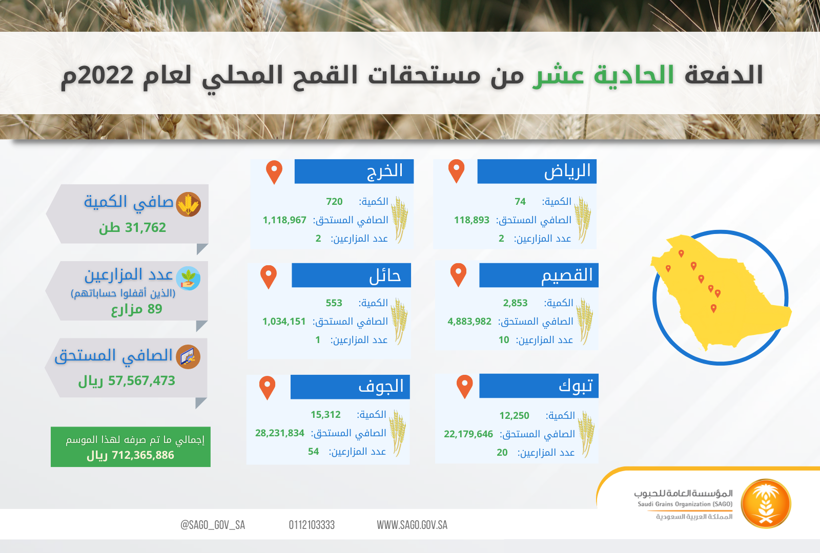 وبلغ إجمالي ما تم إيداعه لحسابات المزارعين البنكية لهذه الدفعة مبلغ (57,567,473) ريال، لصافي كمية مستلمة (31,762) وذلك لعدد (89) مزارعاً، يذكر أن الكمية المستلمة من المزارعين حتى تاريخه بلغت (506,608) طن لعدد (1726) مزارع.