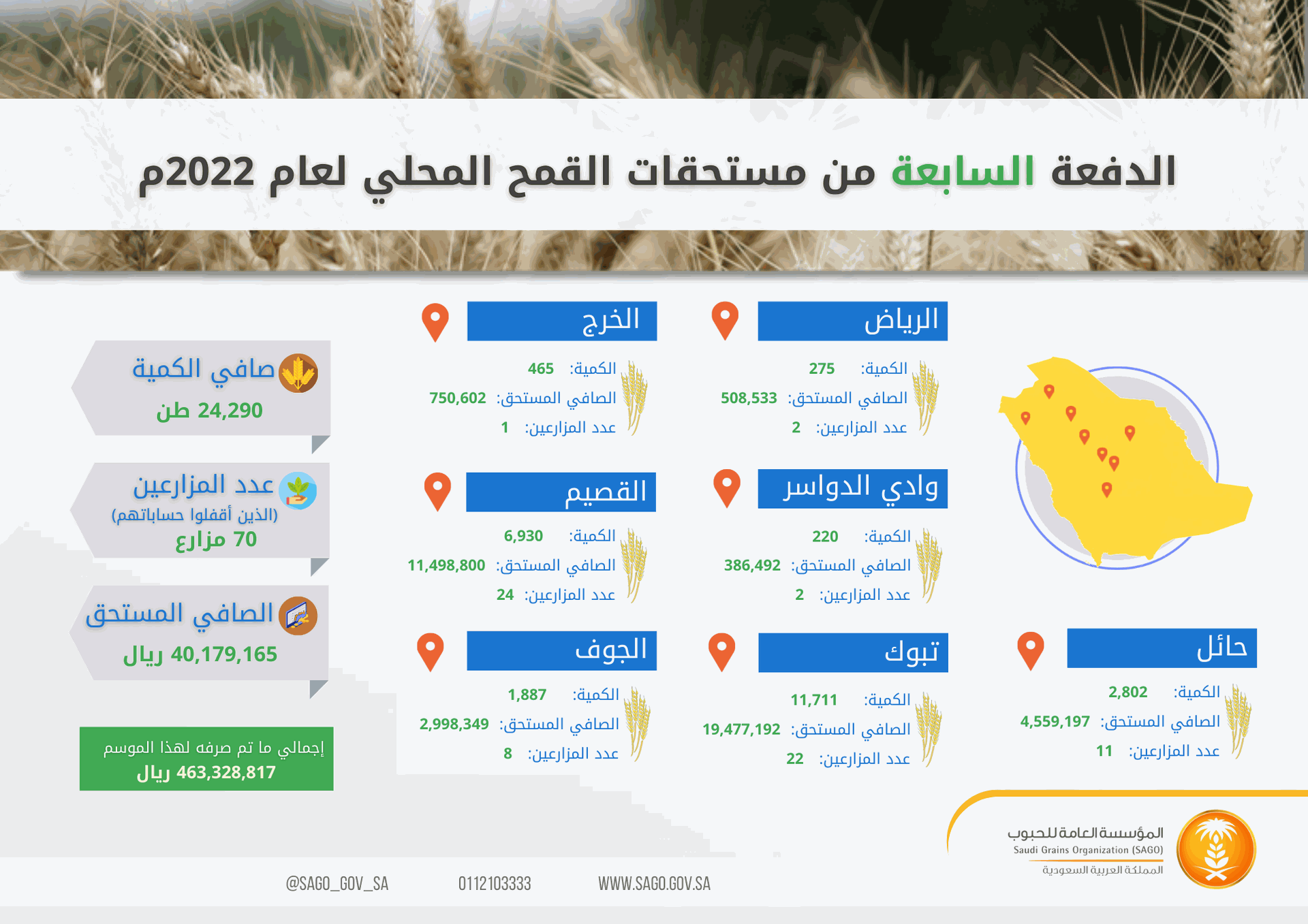 أعلنت المؤسسة العامة للحبوب عن صرف مستحقات الدفعة السابعة من مزارعي القمح المحلي اللذين قاموا بتوريد الكميات المخصصة لهم لهذا الموسم 1443/1444هـ، وأغلاق الحسابات عبر المنصة الإلكترونية "محصولي" على الموقع الرسمي للمؤسسة.