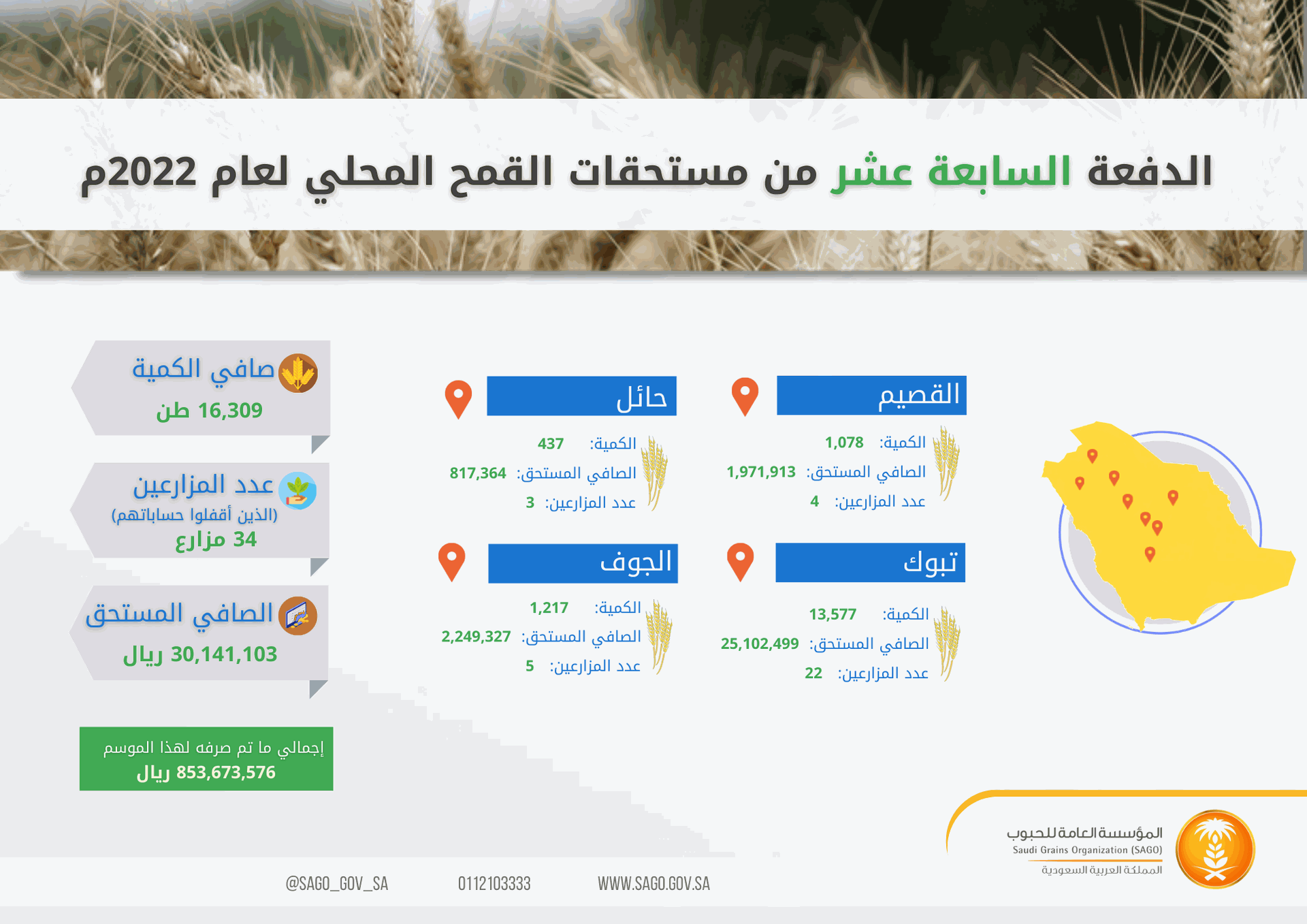 أعلنت المؤسسة عن صرف مستحقات الدفعة السابعة عشر من مزارعي القمح المحلي، للذين قاموا بتوريد الكميات المخصصة لهم لهذا الموسم 1443/1444هـ، وأغلاق الحسابات عبر المنصة الإلكترونية "محصولي" على الموقع الرسمي للمؤسسة.