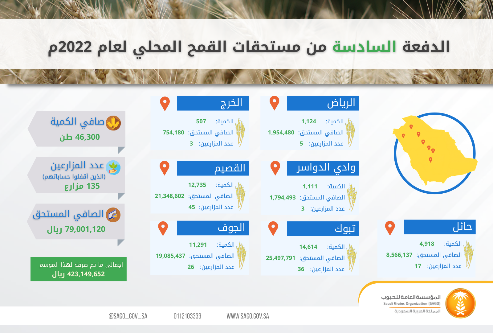 أعلنت المؤسسة عن صرف مستحقات الدفعة السادسة من مزارعي القمح المحلي اللذين قاموا بتوريد الكميات المخصصة لهم لهذا الموسم 1443/1444هـ، وأغلاق الحسابات عبر المنصة الإلكترونية "محصولي" على الموقع الرسمي للمؤسسة.