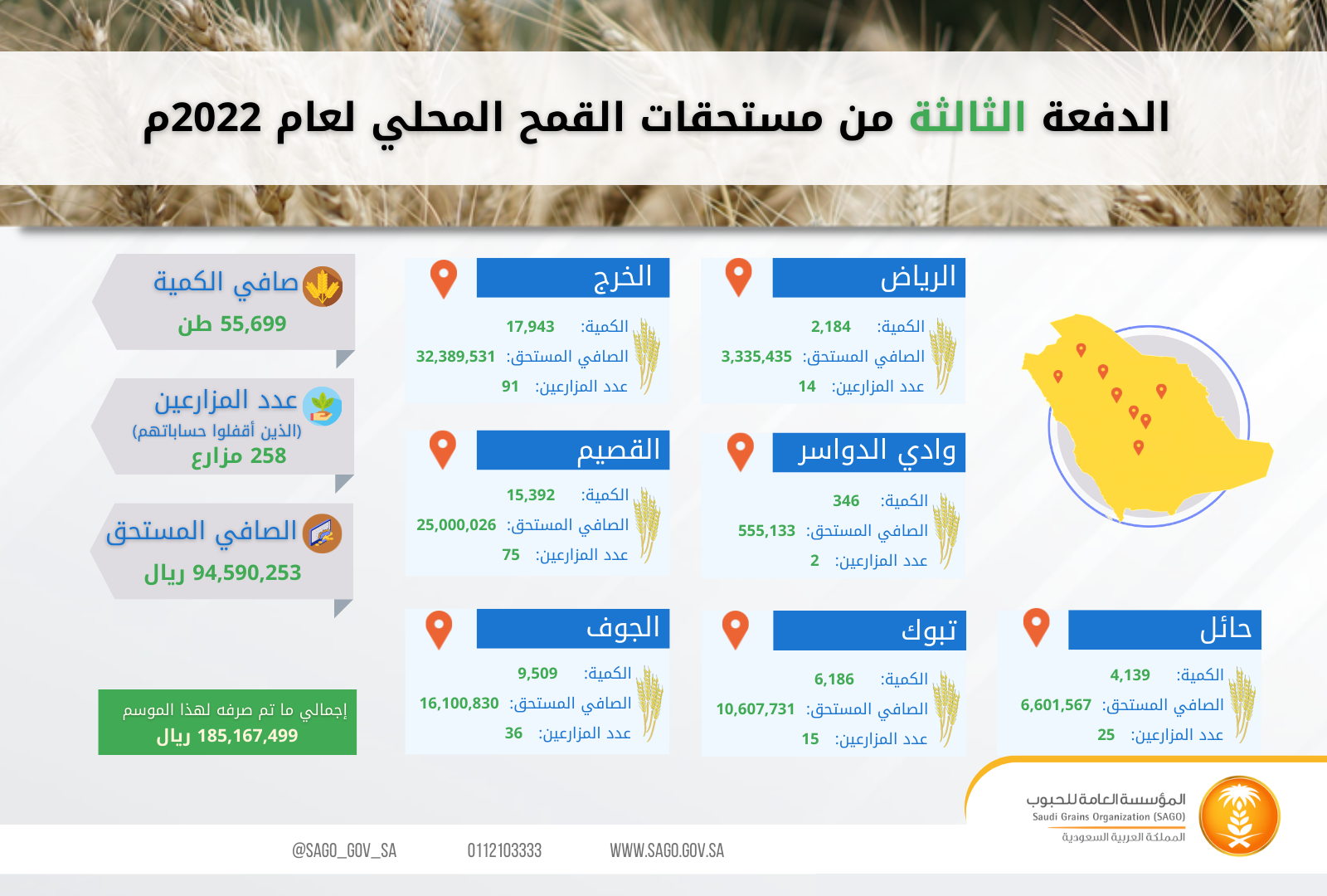 أعلنت المؤسسة العامة للحبوب عن صرف مستحقات الدفعة الثالثة من مزارعي القمح المحلي، شاملة الدفعة الأولى من مستحقي العلاقة التعاقدية بين المزارعين والشركات الزراعية، اللذين قاموا بتوريد الكميات المخصصة لهم لهذا الموسم 1443/1444هـ، وأغلاق الحسابات عبر المنصة الإلكترونية "محصولي" على الموقع الرسمي للمؤسسة.