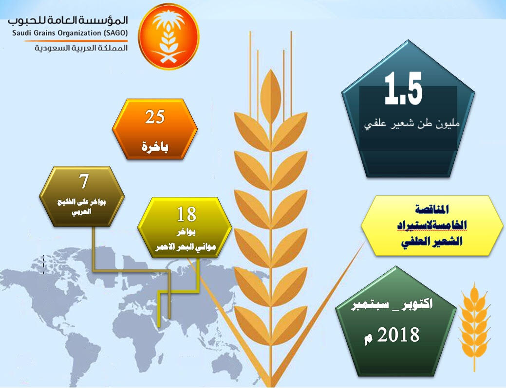 صرح معالى محافظ المؤسسة المهندس أحمد بن عبد العزيز الفارس ان المؤسسة أعلنت اليوم عن مناقصتها الخامسة لهذا العام (2018م) لاستيراد كمية (1.500.000) طن شعير علفي للتوريد خلال الفترة (سبتمبر- أكتوبر2018م) موزعه على عدد (25) باخرة بواقع (18) باخرة لموانئ المملكة على البحر الاحمر و (7) بواخر لموانئ المملكة على الخليج العربي.