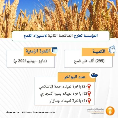 وأفاد معاليه أن طرح هذه الدفعة يأتي في إطار خطة المؤسسة لتغطية الطلب المحلي من شركات المطاحن، والمحافظة على مستويات الخزن الاستراتيجي من القمح، هذا وقد قامت المؤسسة بداية هذا العام بشراء كمية (355) ألف طن من المستثمرين السعوديين في الخارج، إضافة إلى الإعلان عن بدء موسم استلام القمح المحلي لهذا العام يوم الأحد القادم الموافق 4 أبريل 2021م، وهو ما يعزز المخزونات المحلية.