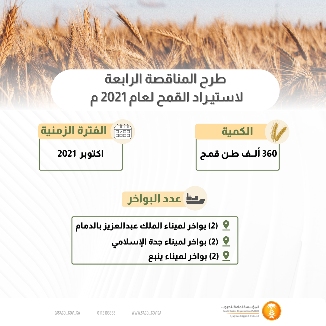 تعلن المؤسسة عن طرح المناقصة الرابعة لهذا العام لاستيراد كمية (360) ألف طن قمح للتوريد خلال شهر أكتوبر 2021. وصرح معالي المحافظ أن الكمية المطروحة موزعة على عدد (6) بواخر بواقع (2) باخرة لميناء جدة الإسلامي، و(2) باخرة لميناء ينبع التجاري، و(2) باخرة لميناء الملك عبدالعزيز بالدمام. وأفاد معاليه أن طرح هذه الدفعة يأتي في إطار خطة المؤسسة لتغطية الطلب المحلي من شركات المطاحن، والمحافظة على مستويات الخزن الاستراتيجي من القمح، يذكر أن المؤسسة قامت منذ بداية هذا العام بترسية توريد كمية (1.2) مليون طن.