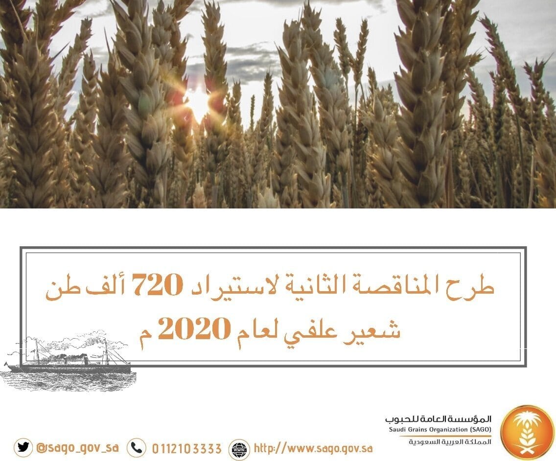 أعلنت المؤسسة عن طرحها المناقصة الثانية هذا العام (2020م) لاستيراد كمية (720) ألف طن شعير علفي للتوريد خلال الفترة (مايو - يونيو 2020م).