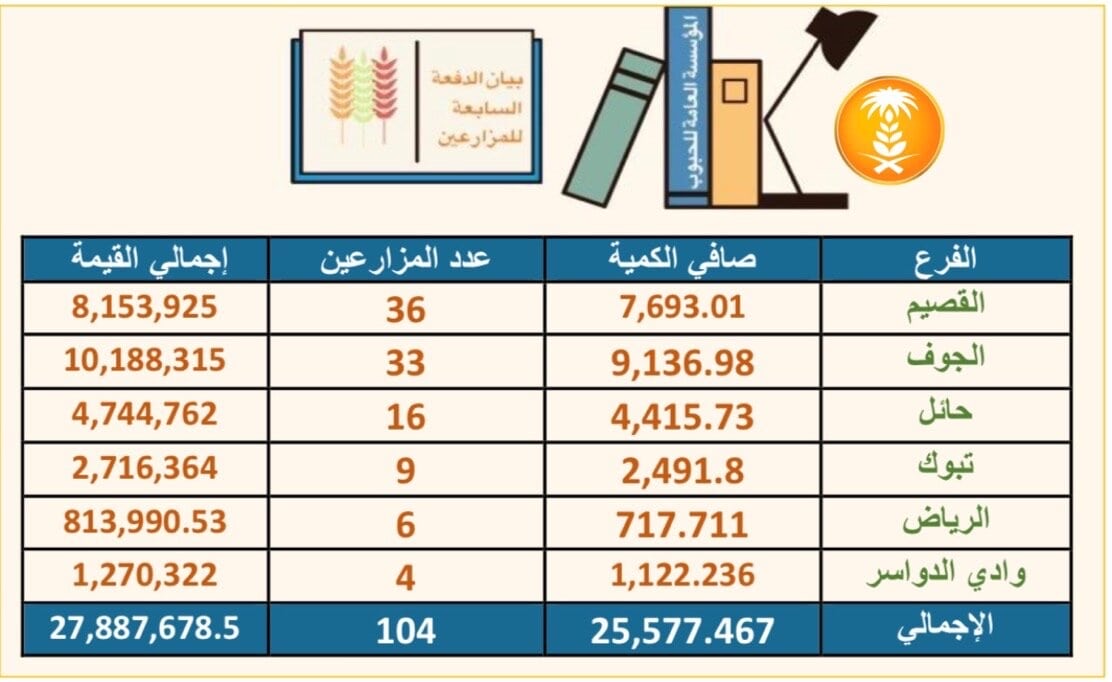 وبهذا يكون ما تم ايداعه مبلغ (182,733,684.5) ريال لعدد (665) مزارعاً بكمية (156,011.12) طن، وسيتم إيداع الدفعات التالية بحسب الكميات الموردة وبعد استكمال إجراءات الاقفال والتدقيق وتهيب المؤسسة بالمزارعين الذين لم يقوموا بإقفال حساباتهم الإسراع في ذلك لضمان سرعة استكمال إجراءات الصرف