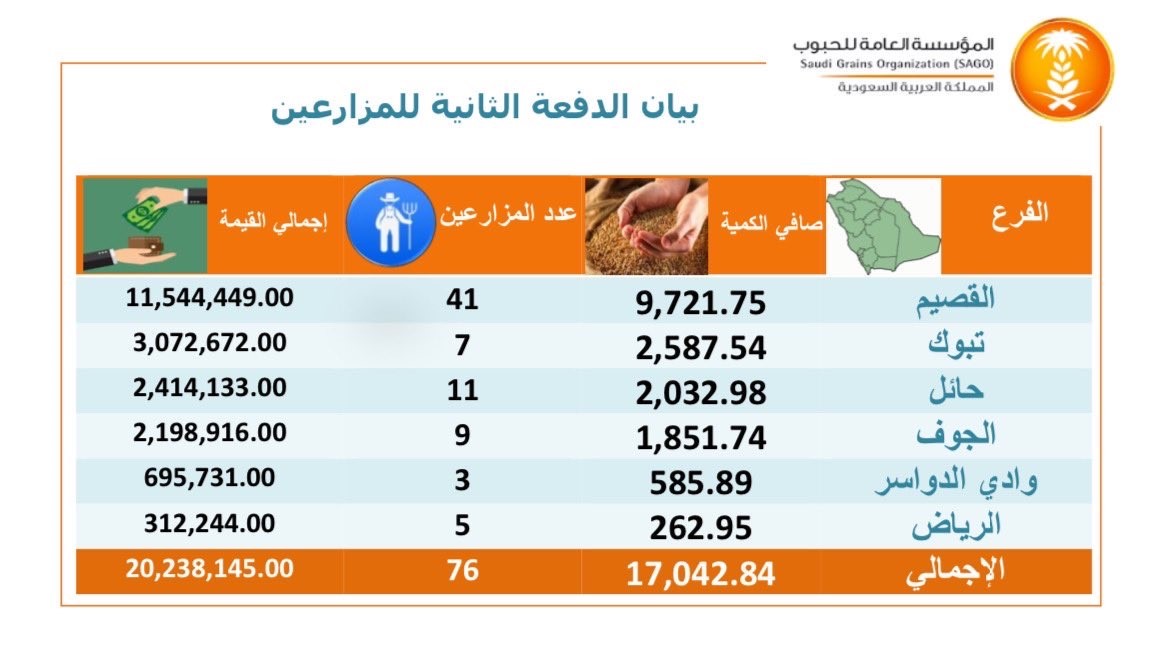 بدأت المؤسسة بإيداع قيمة الدفعة الثانية لشراء القمح المحلي من المزارعين المحليين الذين قاموا بتوريد محصولهم من القمح واقفلوا حساباتهم واستكملوا إجراءاتهم لموسم (1440 /1441هـ) ولا يوجد عليهم مديونيات للصندوق التنمية الزراعية او صندوق التنمية العقاري.
