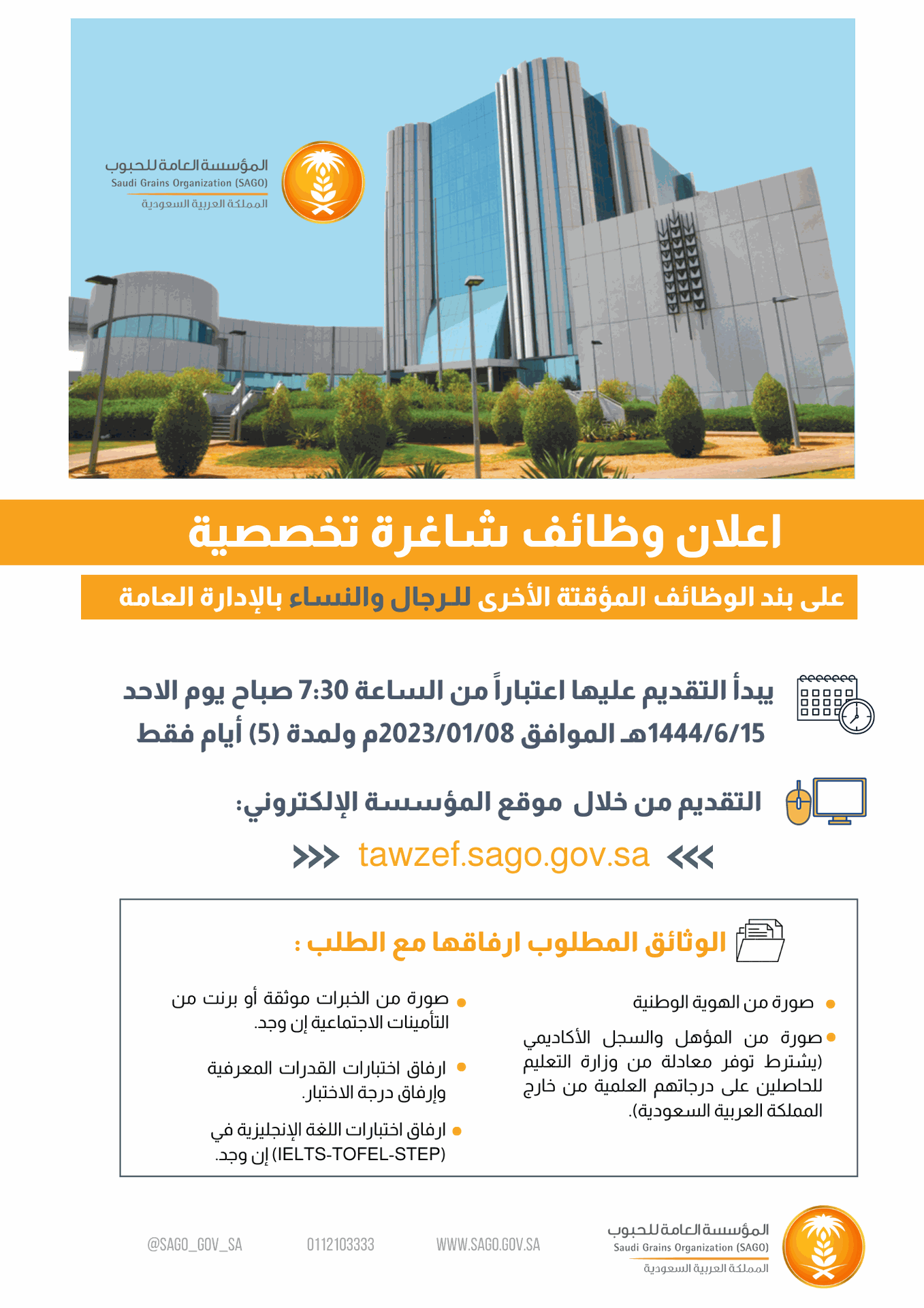 تعلن المؤسسة العامة للحبوب عن طرح وظائف تخصصية في مجال التقنية والتأمين على بند الوظائف المؤقتة الاخرى (بالإدارة العامة).
