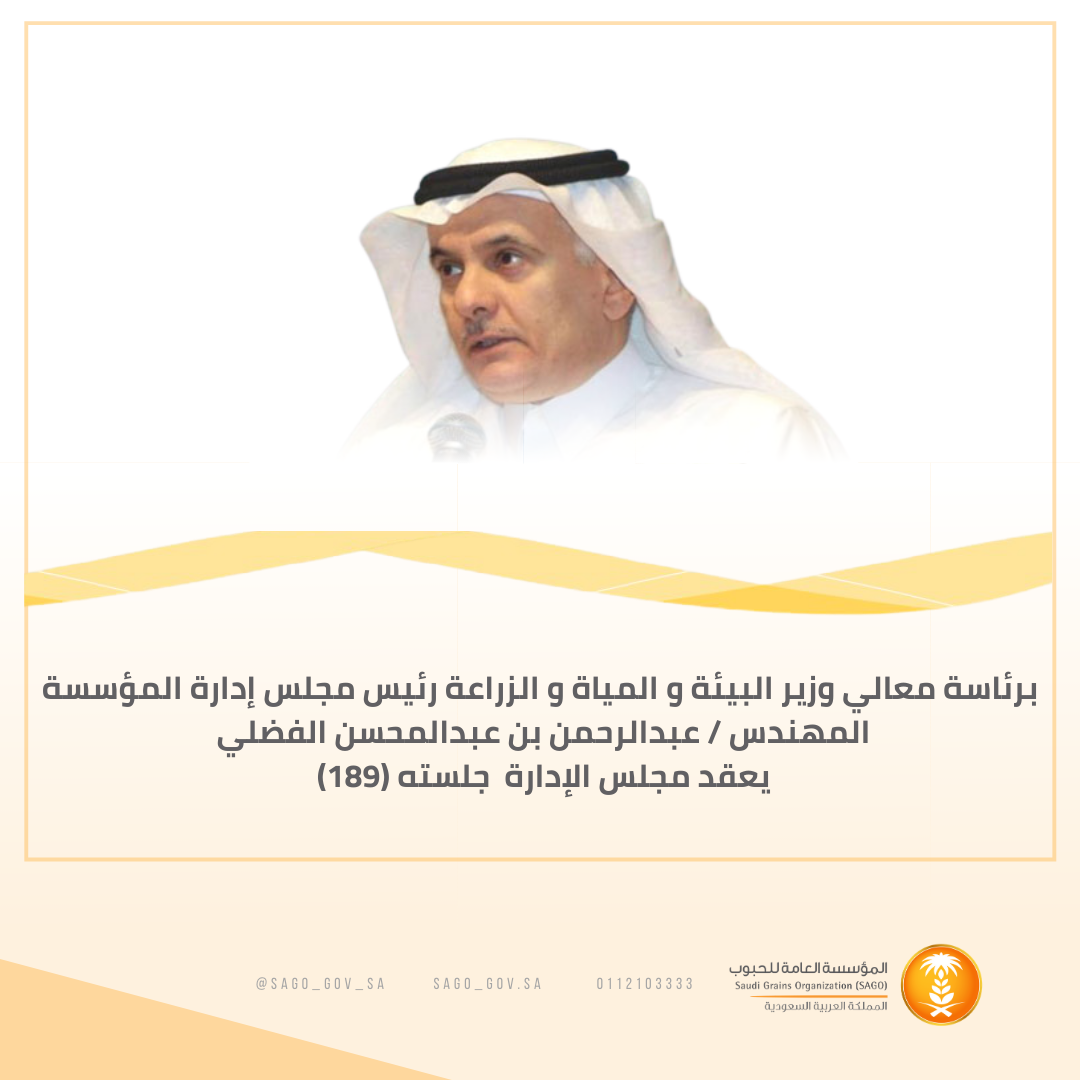 عقد مجلس إدارة المؤسسة جلسته رقم (189) يوم الاثنين 09/03/1442هـ الموافق 26/10/2020م برئاسة معالي وزير البيئة المياه والزراعة رئيس مجلس إدارة المؤسسة المهندس/ عبد الرحمن بن عبد المحسن الفضلي.