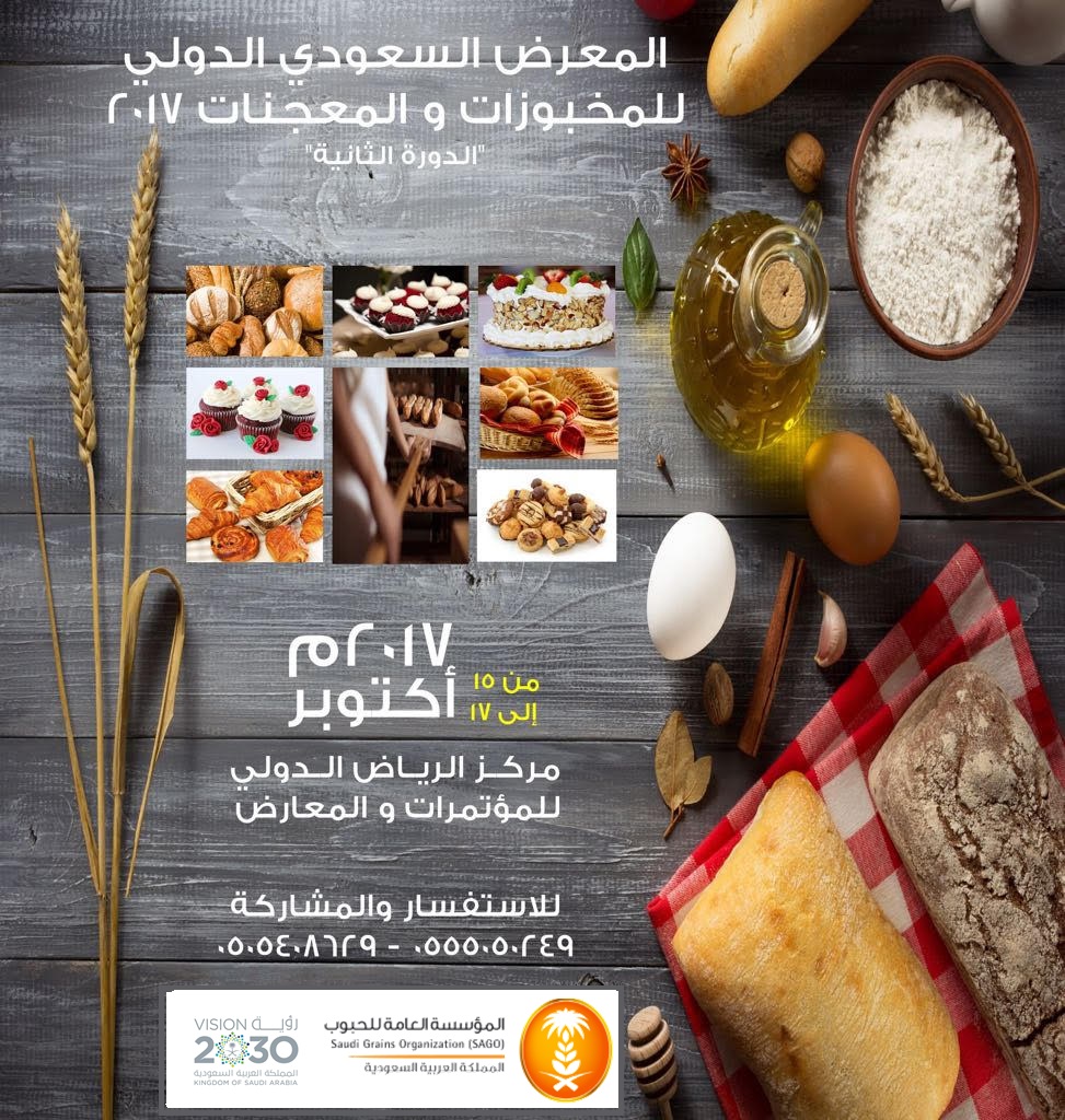 تحت رعاية معالي وزير البيئة والمياه والزراعة رئيس مجلس إدارة المؤسسة المهندس عبدالرحمن بن عبدالمحسن الفضلي، يفتتح المعرض السعودي للمخبوزات والمعجنات 2017 والذي يستضيفه مركز المعارض والمؤتمرات بمدينة الرياض خلال الفتره 25 – 27 محرم 1439هـ والذي يأتي انطلاقاً من دور المؤسسة العامة للحبوب الاستراتيجي والهام والمتمثل في المساهمة بتوفير الأمن الغذائي للمواطنين والمقيمين والزوار من خلال تقديم المادة الغذائية المتعلقة بمنتجات الدقيق بجودة عالية، ودعماً للصناعات الغذائية المرتبطة بهذه المنتجات.