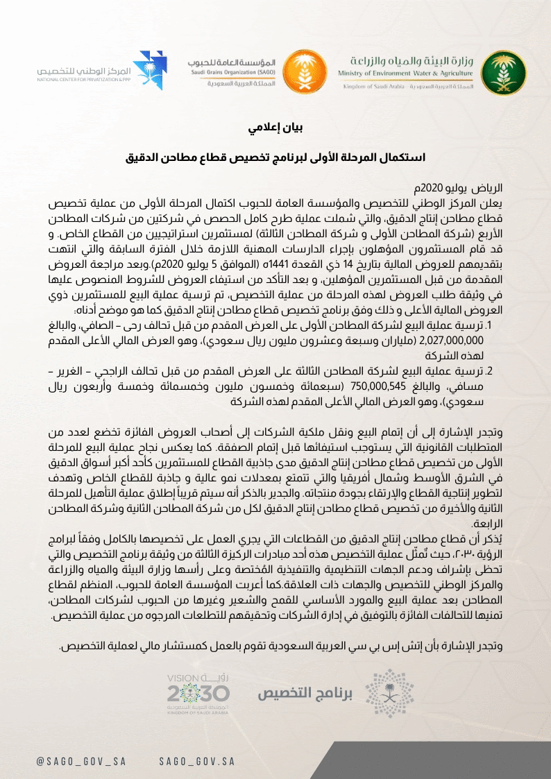 2. ترسية عملية البيع لشركة المطاحن الثالثة على العرض المقدم من قبل تحالف الراجحي – الغرير – مسافي، والبالغ 750,000,545 (سبعمائة وخمسون مليون وخمسمائة وخمسة وأربعون ريال سعودي)، وهو العرض المالي الأعلى المقدم لهذه الشركة وتجدر الإشارة إلى أن إتمام البيع ونقل ملكية الشركات إلى أصحاب العروض الفائزة تخضع لعدد من لمتطلبات القانونية التي يستوجب استيفائها قبل إتمام الصفقة. كما يعكس نجاح عملية البيع للمرحلة الأولى من تخصيص قطاع مطاحن إنتاج الدقيق مدى جاذبية القطاع للمستثمرين كأحد أكبر أسواق الدقيق في الشرق الأوسط وشمال أفريقيا والتي تتمتع بمعدلات نمو عالية و جاذبة للقطاع الخاص وتهدف لتطوير إنتاجية القطاع والإرتقاء بجودة منتجاته. والجدير بالذكر أنه سيتم قريباً إطلاق عملية التأهيل للمرحلة الثانية والأخيرة من تخصيص قطاع مطاحن إنتاج الدقيق لكل من شركة المطاحن الثانية وشركة المطاحن الرابعةـ