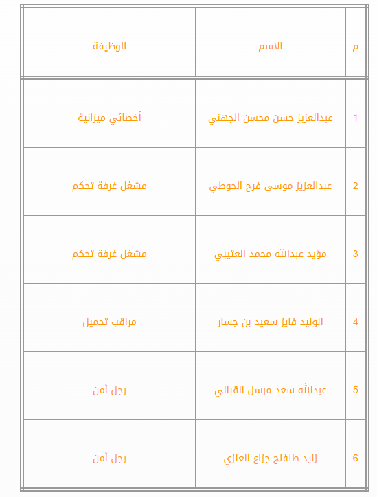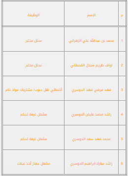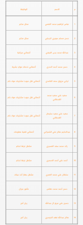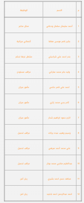 تود المؤسسة ان تعلن عن أسماء المقبولين على وظائف فرع المؤسسة (بخميس مشيط) وتم إبلاغهم برسائل نصية على هواتفهم لإستكمال اجراءات التعيين حسب البيان الاتي: