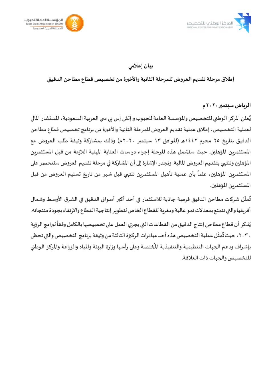 يٌعلن المركز الوطني للتخصيص والمؤسسة العامة للحبوب و إتش إس بي سي العربية السعودية، المستشار المالي لعملية التخصيص، إطلاق عملية تقديم العروض للمرحلة الثانية والأخيرة من برنامج تخصيص قطاع مطاحن الدقيق بتاريخ 25 محرم 1442ه (الموافق 13 سبتمبر 2020م) وذلك بمشاركة وثيقة طلب العروض مع المستثمرين المؤهلين. حيث ستشمل هذه المرحلة إجراء دراسات العناية المهنية اللازمة من قبل المستثمرين المؤهلين وتنتهي بتقديم العروض المالية. وتجدر الإشارة إلى أن المشاركة في مرحلة تقديم العروض ستنحصر على المستثمرين المؤهلين، علماً بأن عملية تأهيل المستثمرين تنتهي قبل شهر من تاريخ تسليم العروض من قبل المستثمرين المؤهلين.