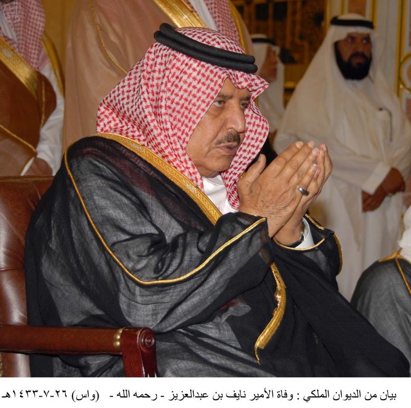 ببالغ الأسى والحزن ينعي خادم الحرمين الشريفين الملك عبدالله بن عبدالعزيز آل سعود أخاه صاحب السمو الملكي الأمير نايف بن عبدالعزيز آل سعود ولي العهد نائب رئيس مجلس الوزراء وزير الداخلية الذي انتقل إلى رحمة الله تعالى هذا اليوم السبت 26/7/1433هـ خارج المملكة ، وسيصلى عليه - إن شاء الله - بعد صلاة المغرب من يوم الأحد الموافق 27/7/1433هـ ، في المسجد الحرام بمكة المكرمة. وإذ يعلن الديوان الملكي ذلك ليُعزي الشعب السعودي في الفقيد. سائلين المولى عز وجل أن يتغمده بواسع رحمته ومغفرته وأن يسكنه فسيح جناته. وأن يجزيه خير الجزاء لما قدمه لدينه ووطنه. (إنا لله وإنا إليه راجعون).