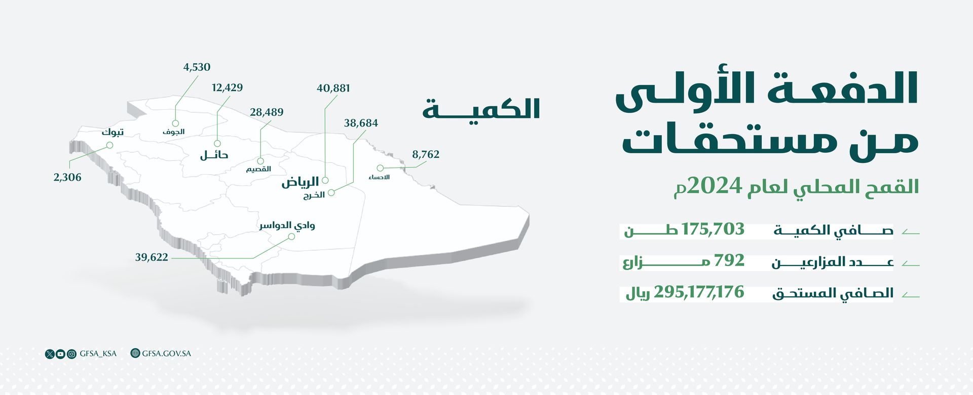 أعلنت الهيئة العامة للأمن الغذائي عن صرف مستحقات الدفعة الأولى لمزارعي القمح المحلي، اللذين قاموا بتوريد الكميات المخصصة لهم لهذا الموسم 1445/1446هـ (2024م)، وأغلاق حساباتهم عبر المنصة الالكترونية "محصولي" على الموقع الرسمي للهيئة.
