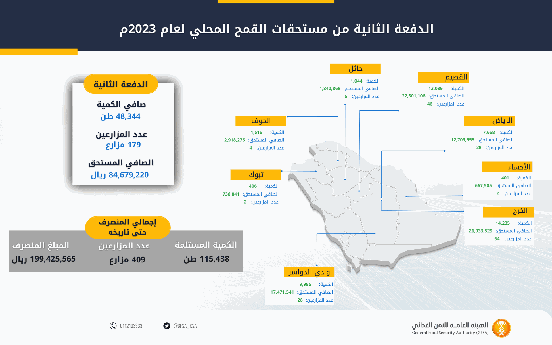 وبلغ صافي ما تم إيداعه في حسابات المزارعين البنكية لهذه الدفعة مبلغ (84,679,220) ريال، وذلك لكمية (48,344) طن، لعدد (179) مزارعاً. تتضمن (46) مزارع من أصحاب العلاقة التعاقدية مع الشركات، ليبلغ إجمالي ما تم صرفه للمزارعين لهذا الموسم مبلغ (199,425,565) ريال، وذلك لكمية (115,438) طن، لعدد (409) مزارع.