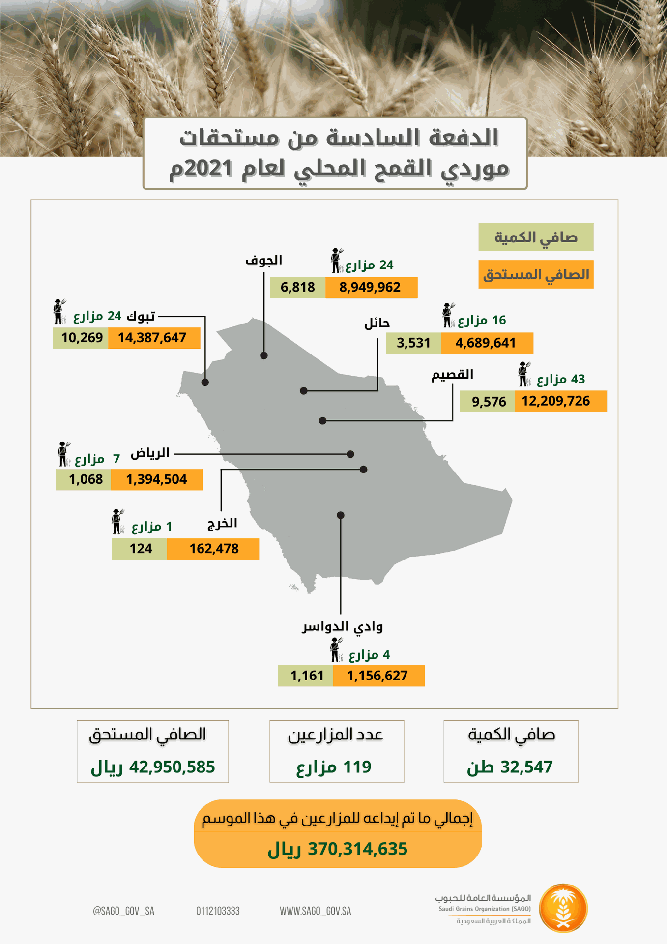 وبلغ إجمالي ما تم إيداعه لحسابات المزارعين البنكية لهذه الدفعة مبلغ (42.950.585) ريال، وذلك لعدد (119) مزارعاً، وبذلك يبلغ إجمالي ما تم إيداعه منذ بداية الموسم مبلغ (370.314.635) ريال لعدد (1126) مزارع وبكمية (285.765) طن.