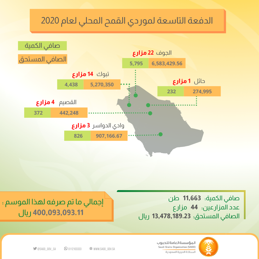 و قد بلغ اجمالي ما تم ايداعه لهذه الدفعة مبلغ (13,478,189.23) ريال بحساباتهم البنكية وذلك لعدد (44) مزارع, وبهذا يكون ما تمّ إيداعه مبلغ (400,093,093.11) ريال لعدد (1,437) مزارع بكمية (344,045) طن ، وسيتم إيداع الدفعات التالية بحسب الكميات الموردة وبعد استكمال إجراءات الاقفال والتدقيق.