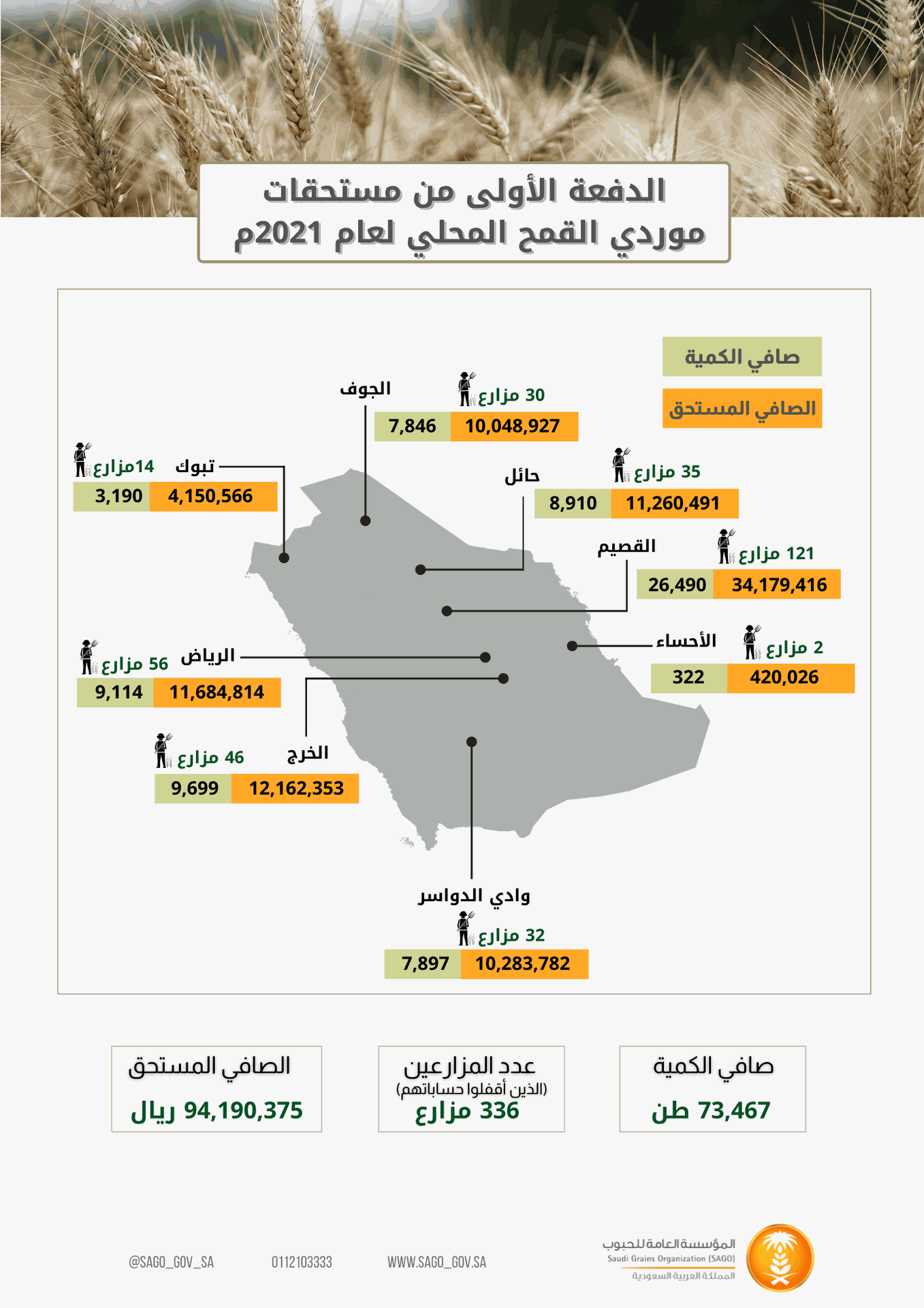 تعلن المؤسسة عن صرف الدفعة الأولى لكامل مستحقات مزارعي القمح المحلي الذين انهوا توريد الكميات المخصصة لهم لهذا الموسم وأغلاق الحسابات عبر المنصة الإلكترونية "محصولي" على الموقع الرسمي للمؤسسة، وذلك بقيمة بلغت نحو (94,2) مليون ريال وتم تحويلها على الحسابات البنكية الخاصة بهم.