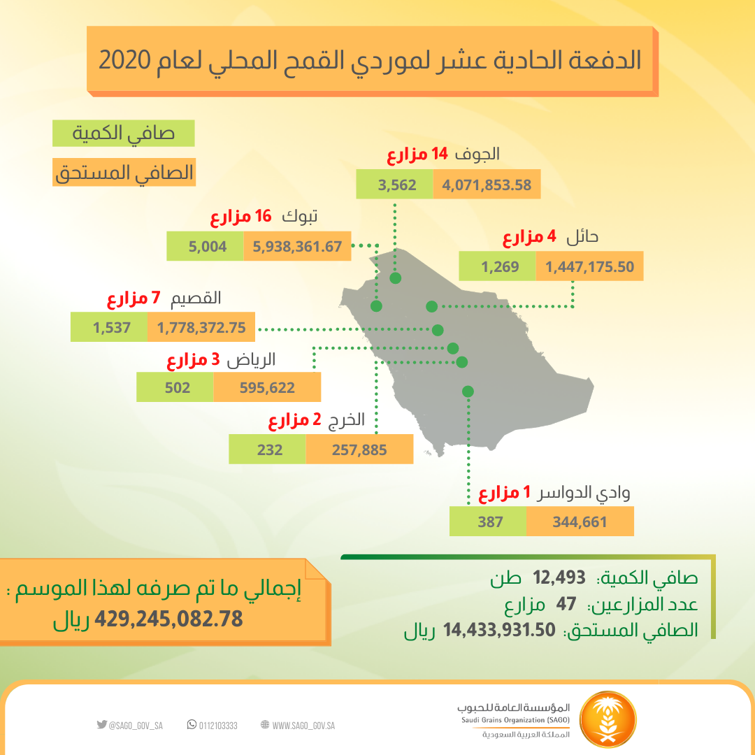 وبلغ اجمالي المبالغ المودعة بحسابات المزارعين البنكية لهذه الدفعة (14,433,931.50) ريال وذلك لعدد (47) مزارع، وبهذا يكون إجمالي المبالغ المودعة لهذا الموسم (429,245,082.78) ريال لعدد (1,525) مزارع وبكمية إجمالية بلغت (369,204) طن.