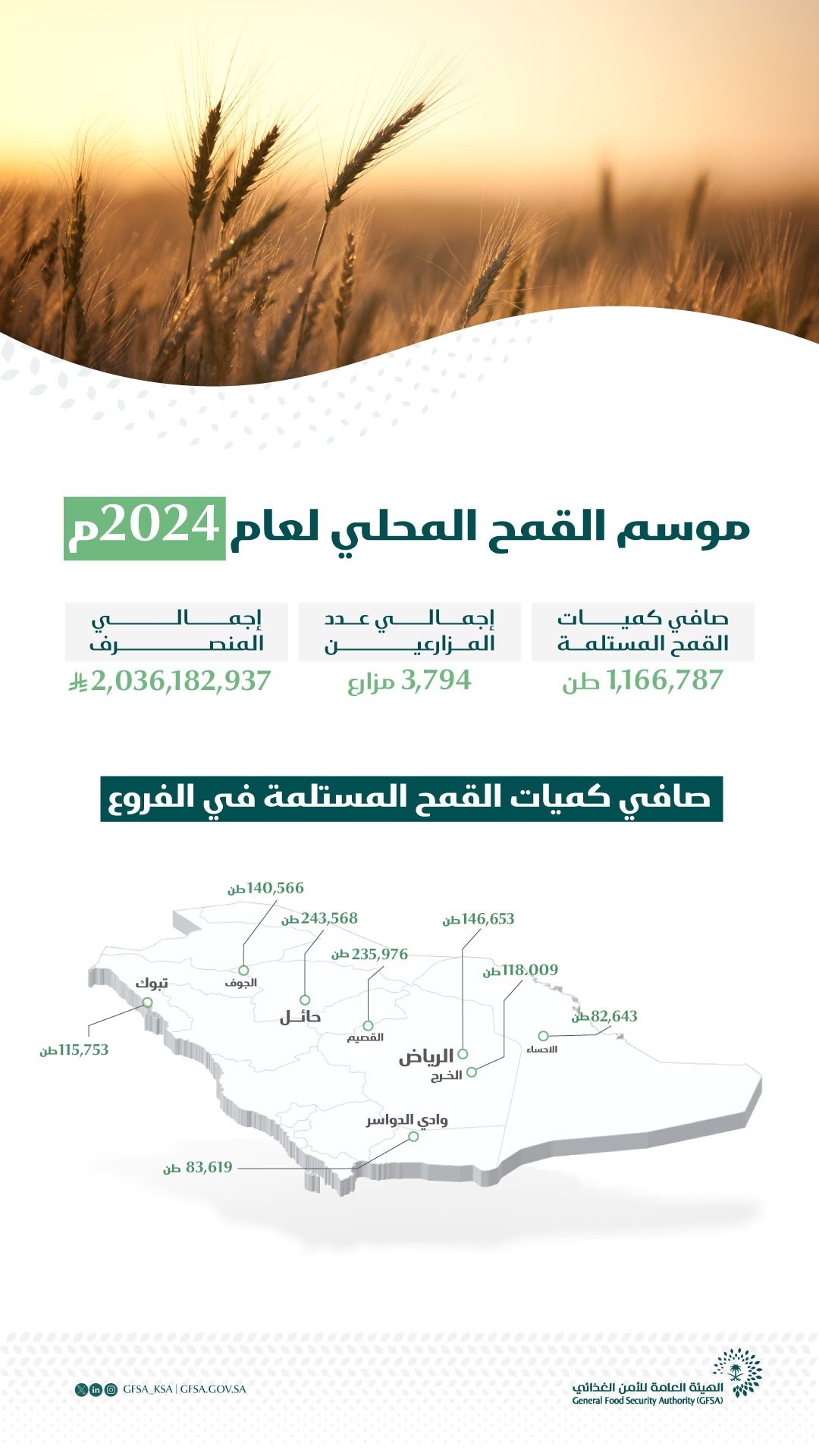 أعلنت الهيئة عن انتهاء موسم شراء القمح المحلي للعام 1445/ 1446هـ (2024م) وذلك بتوريد صافي كمية (1,166,787) طن، وبقيمة بلغت نحو (2) مليار ريال لهذا الموسم.