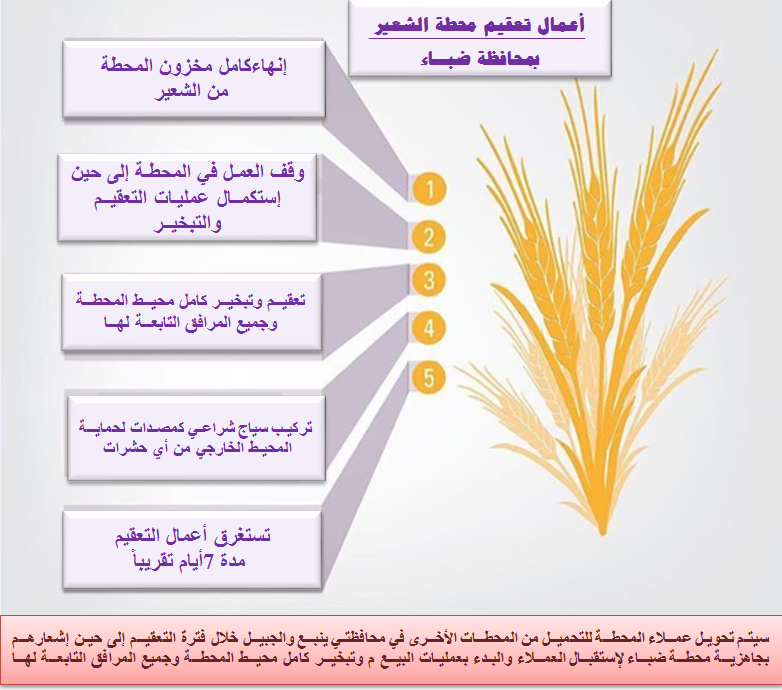 حرصا من المؤسسة العامة للحبوب على سلامة جميـع الإجراءات المتبعــة من قبل المحطات الخاصة بتخزين وبيــع الشعيــر وسلامة جميـع عمليــات المناولــة على المستهلك النهائــي وعلى عمــوم المواطنيــن والمناطق المأهولـة بالسكــان ، ونظرا للملاحظات التي تم متابعتهــا من قبل المؤسســة على محطة الشعيــر بمحافظــة ضبــاء خلال الفترة الماضيــة ، عليــه تود المؤسسـة أن توضح عن بدء تنفيــذ عــدد من الإجــراءات الوقائيــة اللازمة للمحطــة وذلك من خلال تعقيــم وتبخيــر كامل محيــط المحطــة وجميع المرافق التابعــة لهــا والآليــات المستخدمــة وذلك فــور إنهــاء كامل المخزون في المحطــة والمتــوقع خلال الأيــام القليلة القادمــة ، إضافــة إلـى البــدء في عمليــات تركيـب سياج شراعـي يحيـط بكامل محيط المحطــة ويعمل كمصـدات لحمايــة المحيـط الخارجي من أي حشرات إن وجــدت .