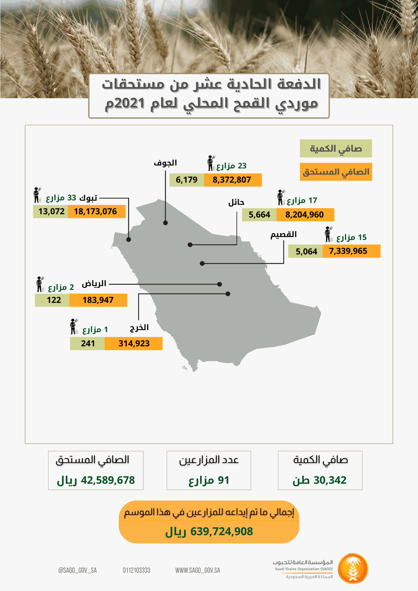 وبلغ إجمالي ما تم إيداعه لحسابات المزارعين البنكية لهذه الدفعة مبلغ (42.589.678) ريال، لصافي كمية مستلمة (30.342) طن، وذلك لعدد (91) مزارعاً، منهم عدد (6) مزارع وشركة من أصحاب العلاقة التعاقدية، وبذلك يبلغ إجمالي ما تم إيداعه منذ بداية الموسم مبلغ (639.724.908) ريال لعدد (1787) مزارع وبكمية (484.781) طن.