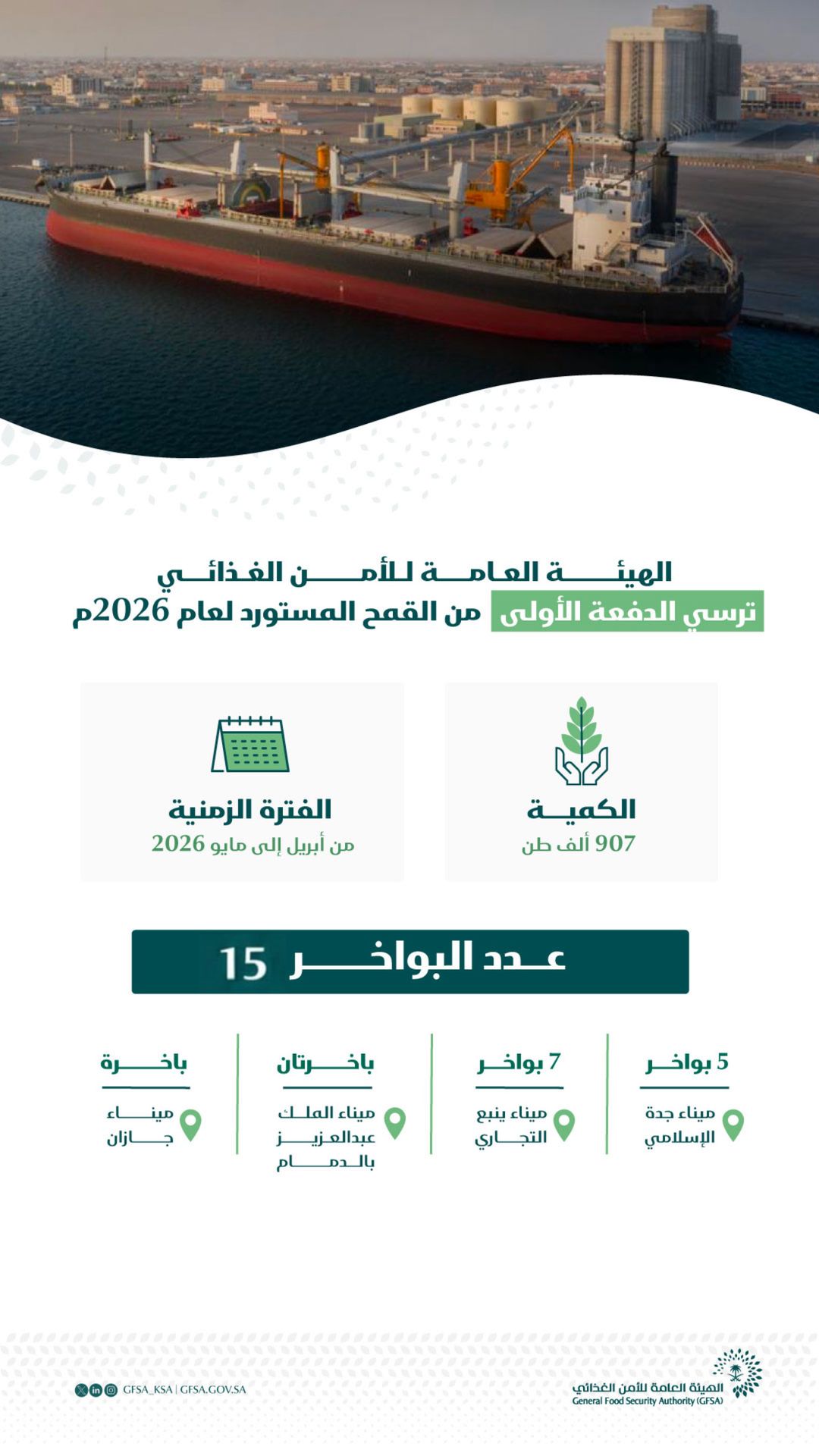 أتمت الهيئة العامة للأمن الغذائي إجراءات ترسية الدفعة الأولى من القمح المستورد لهذا العام (2026م) بكمية (907,000) طن للتوريد من مناشئ (الاتحاد الأوروبي، وأمريكا الشمالية والجنوبية، وأستراليا، والبحر الأسود).