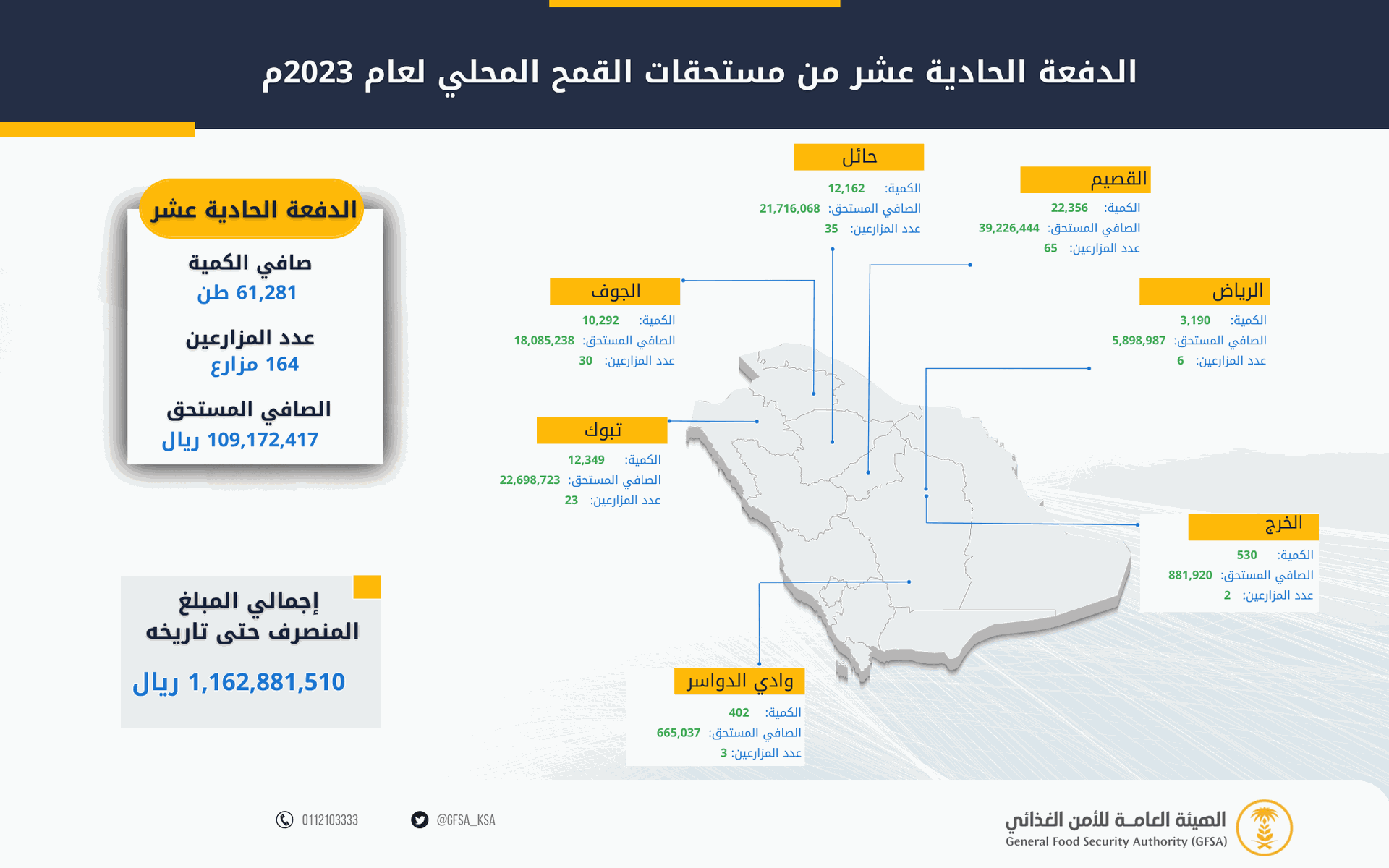 وبلغ صافي ما تم إيداعه في حسابات المزارعين البنكية لهذه الدفعة مبلغ (111,816,546) ريال، وذلك لكمية (61,916) طن، لعدد (163) مزارعاً. تتضمن (14) مزارعين من أصحاب العلاقة التعاقدية مع الشركات، ليبلغ إجمالي ما تم صرفه للمزارعين لهذا الموسم مبلغ (1,053,709,093) ريال، وذلك لكمية (598,851) طن، لعدد (1896) مزارع.