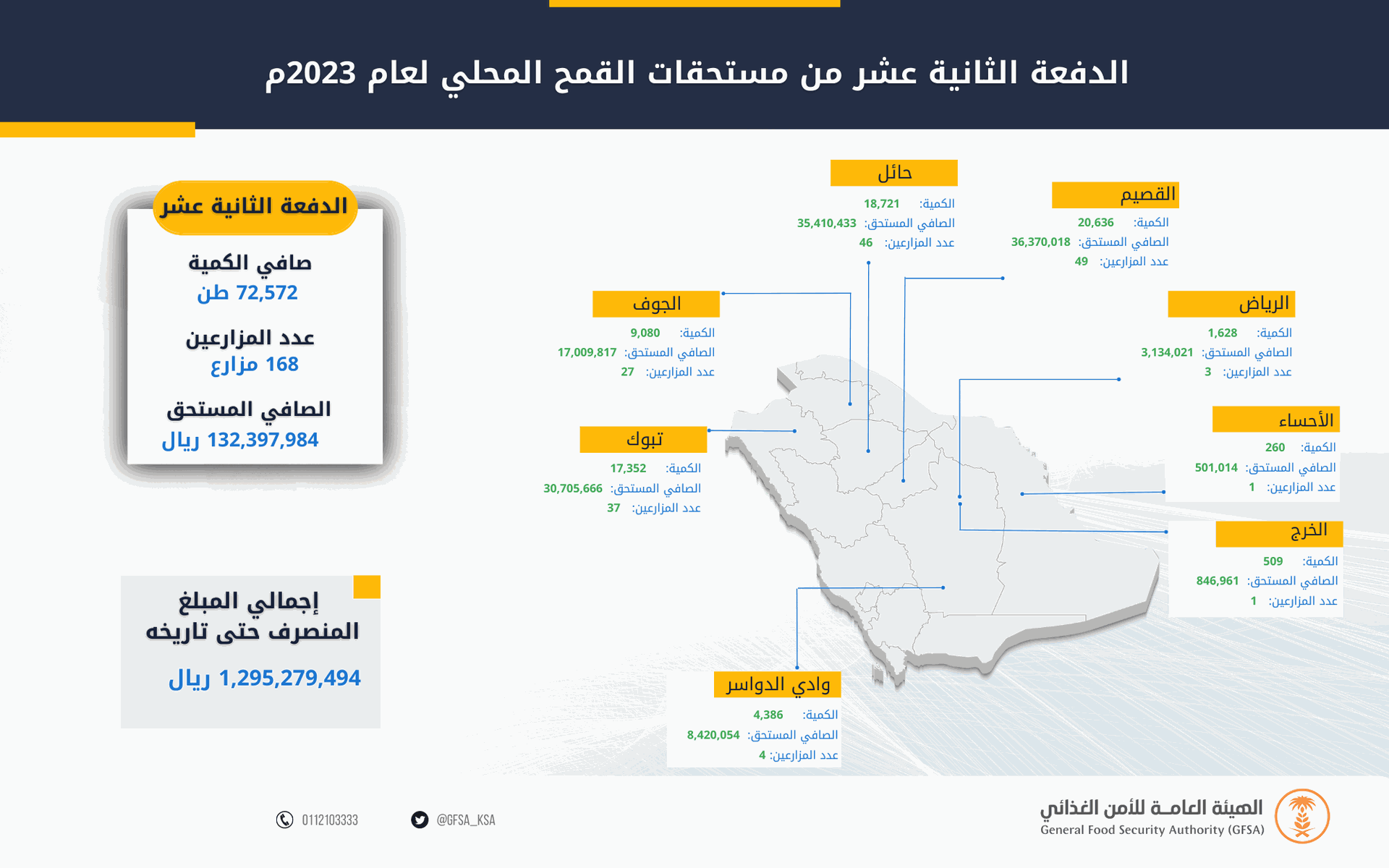 وبلغ صافي ما تم إيداعه في حسابات المزارعين البنكية لهذه الدفعة مبلغ (132,397,984) ريال، وذلك لكمية (72,572) طن، لعدد (168) مزارعاً. تتضمن (10) مزارعين من أصحاب العلاقة التعاقدية مع الشركات، ليبلغ إجمالي ما تم صرفه للمزارعين لهذا الموسم مبلغ (1,295,279,494) ريال، وذلك لكمية (732,705) طن، لعدد (2228) مزارع.