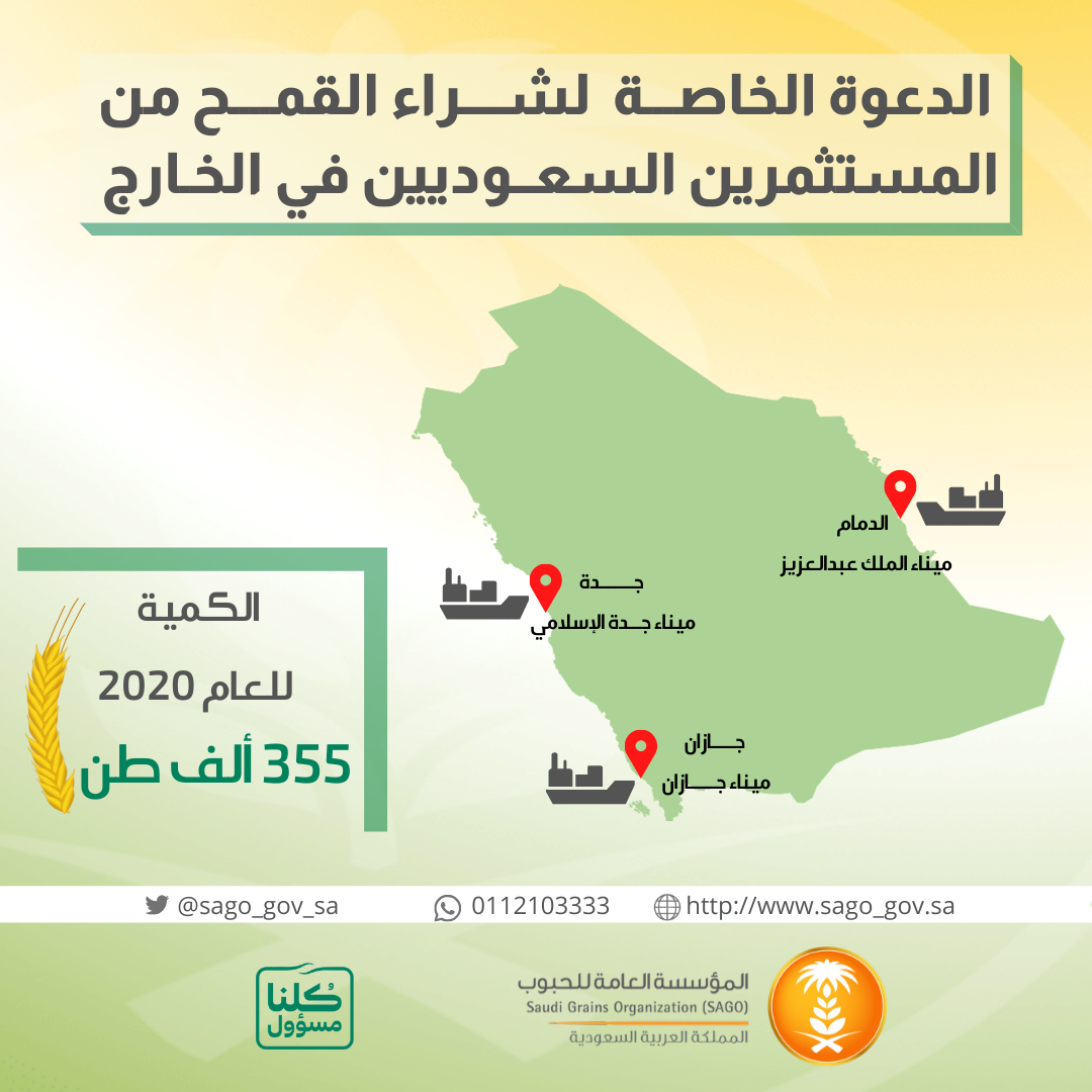 تنفيذا للأمر السامي الكريم بالموافقة على طرح دعوة خاصة لتوريد ١٠٪؜ من احتياجات المملكة من القمح للمستثمرين السعوديين في الخارج، تعلن المؤسسة اليوم عن طرح دعوة للمستثمرين المؤهلين لتوريد كمية (355) ألف طن قمح.