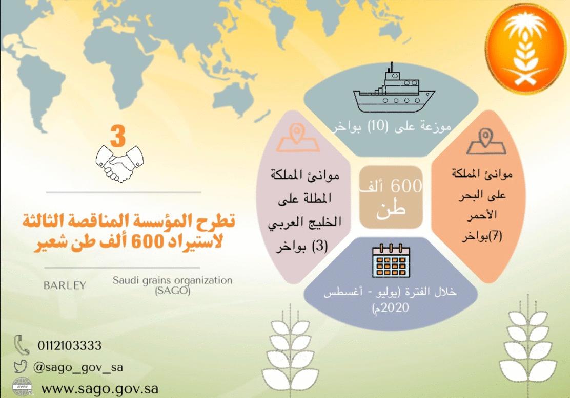 تعلن المؤسسة العامة للحبوب عن طرحها المناقصة الثالثة هذا العام (2020م) لاستيراد كمية (600) ألف طن شعير علفي للتوريد خلال الفترة (يوليو - أغسطس 2020م).