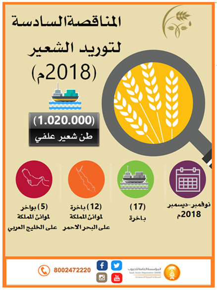 صرح معالى محافظ المؤسسة العامة للحبوب المهندس أحمد بن عبد العزيز الفارس ان المؤسسة أعلنت اليوم عن مناقصتها السادسة لهذا العام (2018م) لاستيراد كمية (1.020.000) طن شعير علفي للتوريد خلال الفترة (نوفمبر- ديسمبر2018م) موزعه على عدد (17) باخرة بواقع (12) باخرة لموانئ المملكة على البحر الاحمر و (5) بواخر لموانئ المملكة على الخليج العربي.